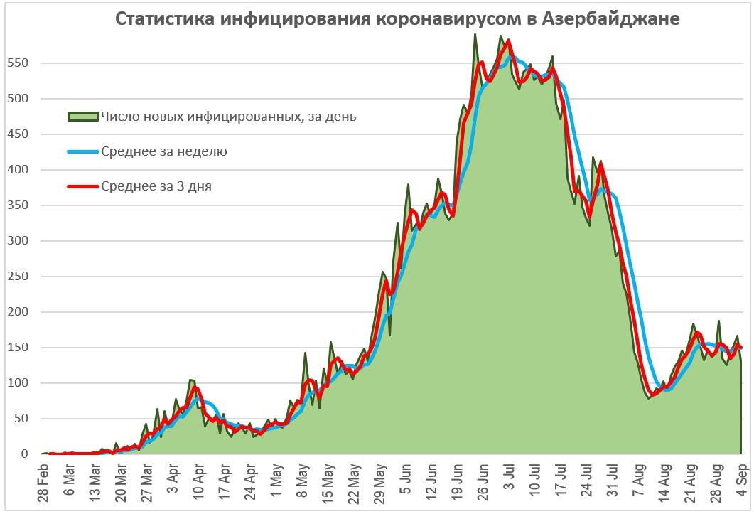 Как мы видим, после первой малой волны, не полностью погашенной карантином, начался новый рост и заболеваемость действительно вышла на пик к началу июля, а уже с середины июля волна пошла на спад, ну а в настоящий момент ситуация стабильна и фиксируется суточно порядка 150 случаев ковида. Замечу, что, хотя некоторые азербайджанцы заявляли, что митинги за войну в центре Баку никак не повлияли на распространение ковида и вообще Азербайджан уже не так уязвим к болезни, в действительности это не так. Если принять на веру версию, что в Азербайджане за все время инфицировались лишь 39 тысяч человек, то это означает, что меньше 1% приобрели иммунитет, а значит подверженными являются остальные более чем 99% населения.