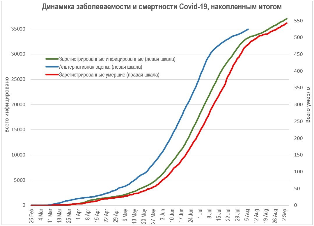 Сценарий 2: Азстат не искажает смертность в национальном масштабе, но степень занижения масштабов эпидемии, характерная для марта-июня, существенно снизилась в июле-августе |