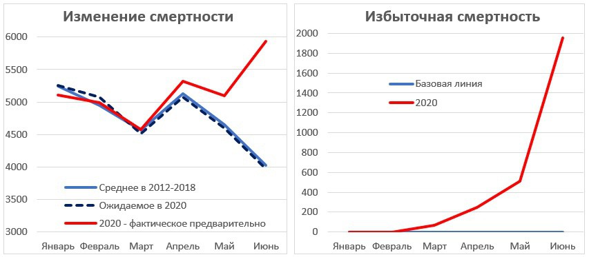 Итак, прирост числа умерших в 2020 году относительно 2019 года составил 2271 человек, относительно среднего за 2012-2019 – 2437, с добавлением календарного фактора – 2312, с учетом снижения от внешних причин – почти 2600, а с учетом известной нам более низкой смертности в январе-феврале, 2776. И это на фоне известных 213 смертей от ковид-19.