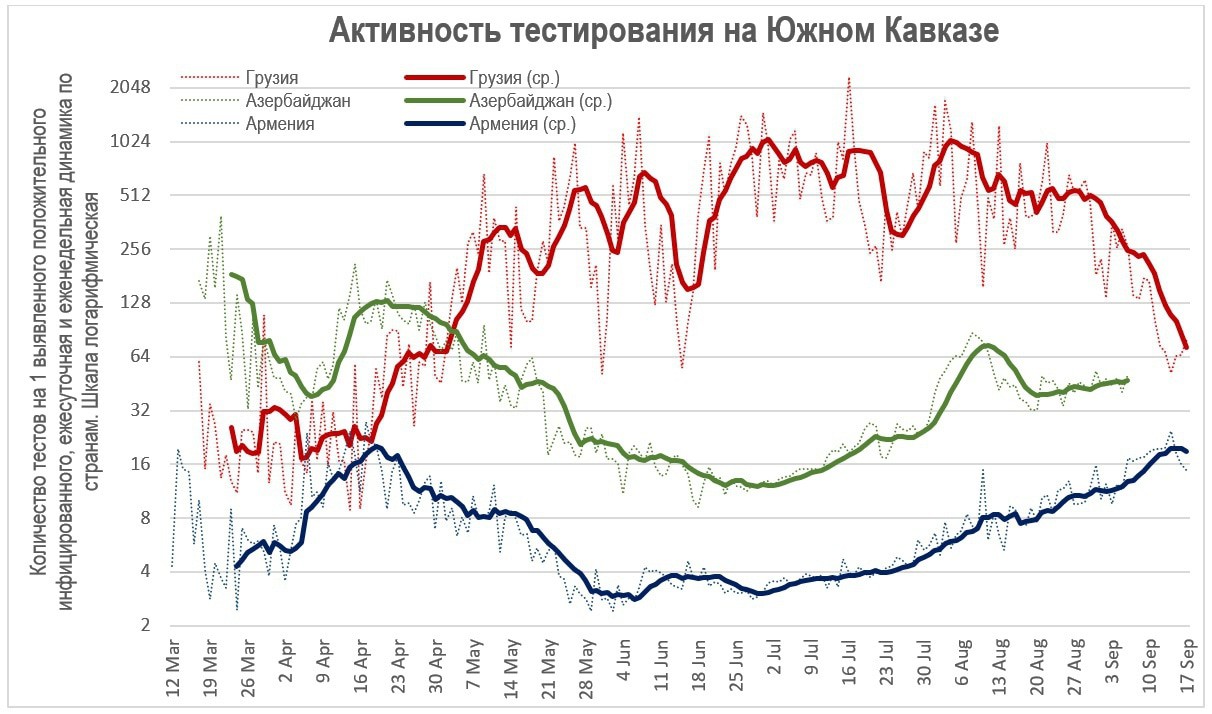 Как мы видим, распространение вируса действительно ускорилось. Но более того, число активных случаев растет практически экспоненциально: 3 сентября это было 270 человек, 10 сентября 477, 17 сентября 1470. Чтобы сдержать распространение болезни, в Грузии активно проводится тестирование. Вчера было проведено 14 тысяч тестов, а вообще объемы тестирования практически беспрецедентные. Всего Test Positivity Rate составляет 0.57%, то есть на одного обнаруженного инфицированного за все время около 176 тестов, а вчера этот показатель составлял 81, что тоже очень хорошо. Большой объем тестирования – одно из множества средств, позволяющих Грузии не допустить стремительного роста числа инфицированных. За весь период на одного положительного в Грузии было сделано в среднем 176 тестов, в Азербайджане 26.6, в Армении 5.4. Соответственно, в Азербайджане доля позитивных тестов составляла 3.8%, а в Армении – 18.5%.