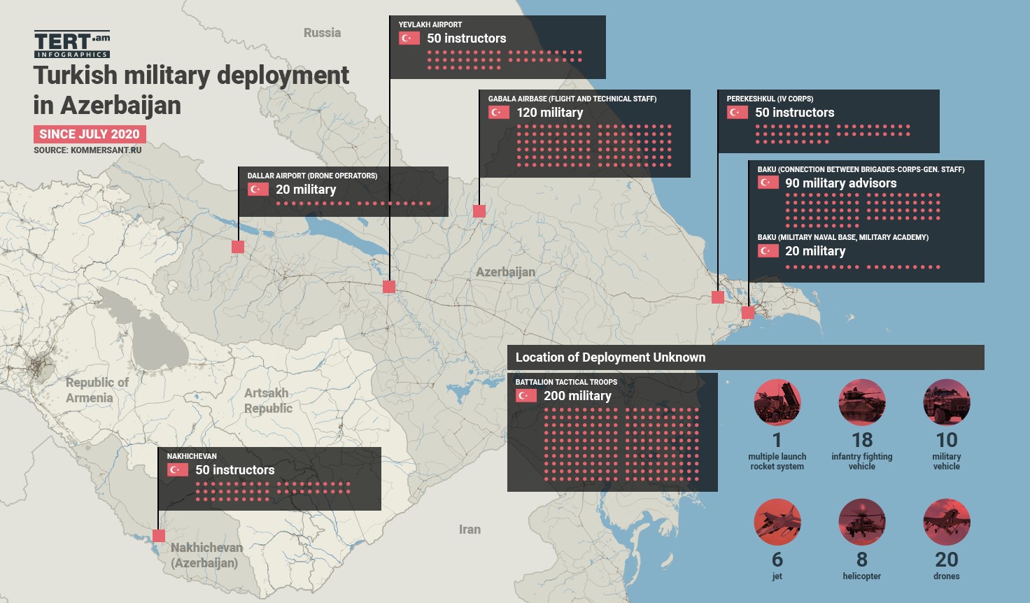 Турция выстраивает в Азербайджане свою инфраструктуру и де-факто ставит базы, хотя официально этот процесс еще не оформлен. Но на начало войны, в Азербайджане, согласно статье "Принуждение к конфликту", было 600 турецких офицеров, в том числе 50 инструкторов в Нахиджеване, 20 специалистов в аэропорте Даллар (управление дронами), 50 инструкторов в Евлахе (аэропорт), 120 специалистов на базе ВВС в Габале, 200 человек - батальонно-тактическая группа, 90 военных советников в Баку, 20 моряков на базе в Баку, 50 инструкторов в Перекешкюле. Также, там 6 самолетов, 8 вертолетов, 20 дронов, 1 РСЗО, 18 БМП и 10 прочих военных автомобилей. Графически это выглядит так. (инфографика от Седрака Мкртчяна).