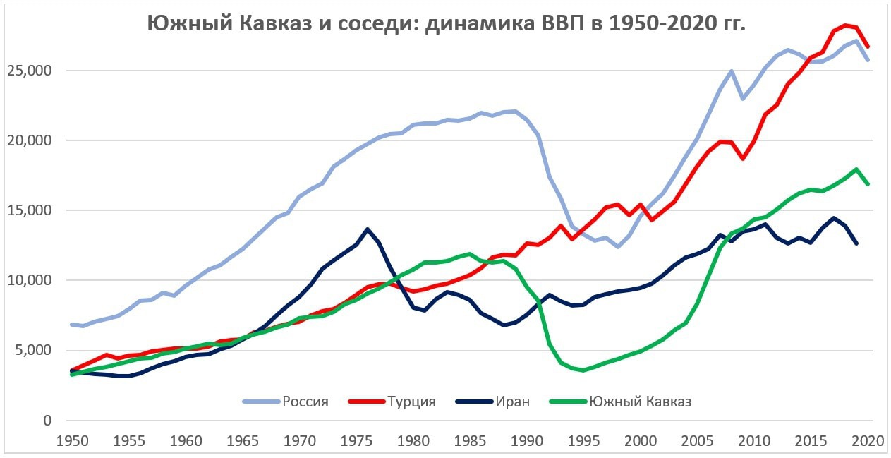 На фоне развала общего рынка, трансформации к капитализму, прекращения дотаций из центра, шоковой терапии и в целом часто ошибочной политики новых независимых стран, экономика начала разваливаться, что усиливалось вооруженными конфликтами и разрывом коммуникаций. Вслед за этим начался восстановительный рост, прерываемый кризисами 2008/9 и 2020 гг., а в Азербайджане начиная с 2005 года произошел скачок благодаря открытию трубопроводов БТД, БТЭ, Баку-Супса, росту добычи нефти на месторождении АЧГ, и росту цен на нефть. Экономические показатели Армении и Грузии, как мы видим, при корректном расчете численности населения, практически идентичны на протяжении всего периода независимости.