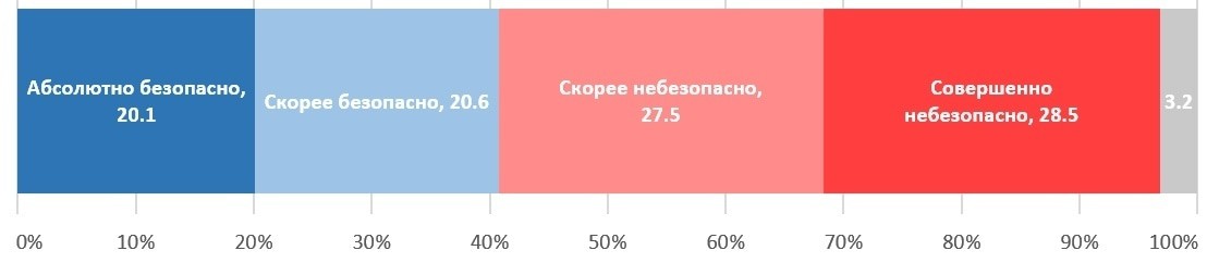На данный момент всего лишь почти 41% считают, что жить в Армении безопасно, тогда как 56% считают, что это небезопасно. В том числе, 20.1% считают, что жизнь в Армении абсолютно безопасна и 28.5% - считают, что совершенно небезопасна. Еще чуть более 3% не определились с ответом. Впрочем, надо сказать, что 41% - не так уж мало, учитывая все обстоятельства и реальные долгосрочные тенденции в стране и вокруг. Результаты – на графике.