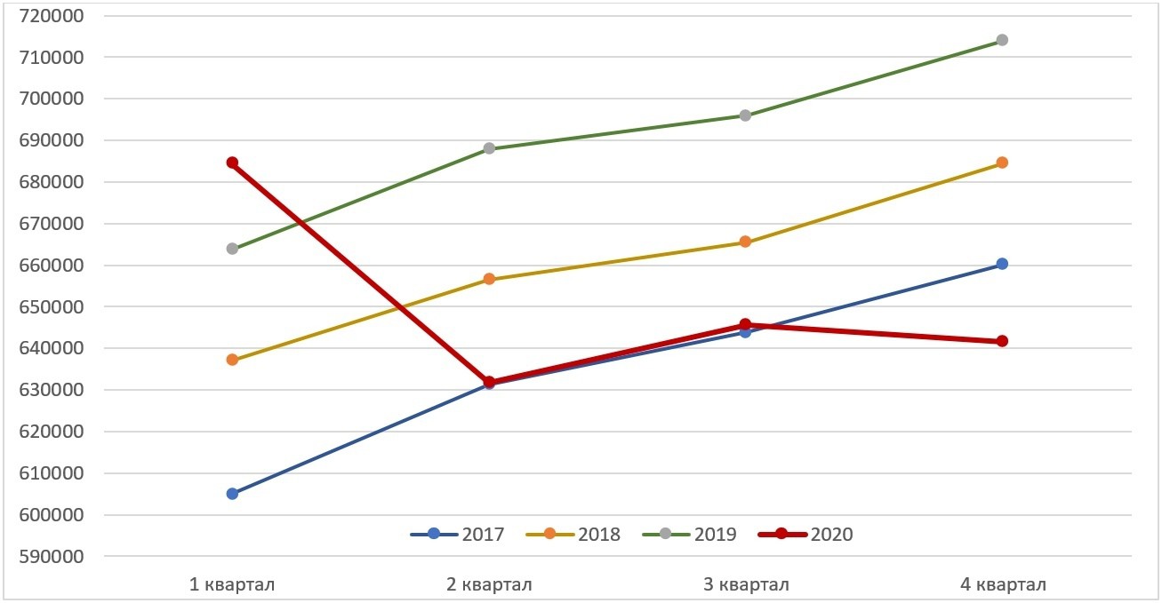 График 2. Динамика числа занятых в бизнес-секторе Грузии по кварталам, 2008-2020 гг.