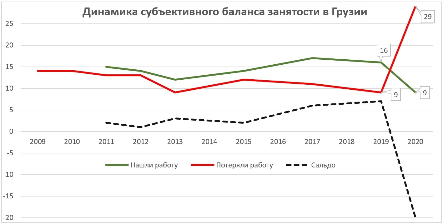 Для оценки субъективной картины, можно использовать опрос «Кавказский барометр» CRRC, проведенный в Грузии в конце 2019 и в конце 2020 года, так что сравнение их результатов как раз покажет изменения в стране, произошедшие на фоне коронавируса, в особенности во втором и третьем квартале 2020 года.