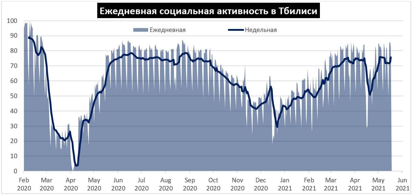 Согласно этим данным, годовая активность на рабочих местах в Грузии снизилась примерно на 27%, а в Тбилиси – на 34% (2020 год). В мае 2021 года снижение составляло 17%, а в последней декаде мая уже лишь 5% (ок. 10% относительно февраля 2020 года во всей Грузии и ок. 8.4% по Тбилиси). Это складывается как из сокращения числа рабочих мест, так и из перевода части работников в онлайн, и из перевода других в вынужденный отпуск, а также ряда других факторов. Характерно, что если весной-летом прошлого года в Тбилиси уровень снижения был выше, поскольку карантин соблюдался сильнее, то сейчас Тбилиси стал уже обходить средние показатели по Грузии, то есть экономика Тбилиси, скорее всего, выходит из кризиса быстрее. Взглянем также на индекс активности Яндекса за тот же период.