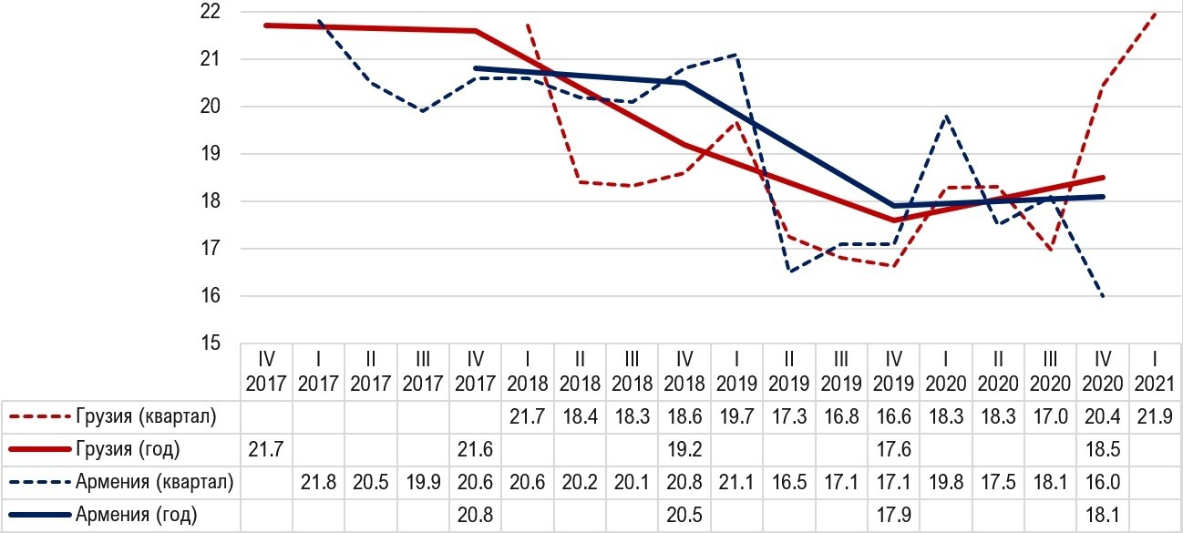 График 3. Динамика безработицы в Грузии и Армении, 2017-2021