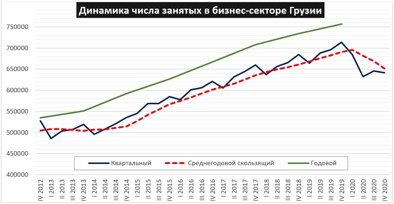 Основные причины для роста безработицы в 2020 году очевидны – это ковид-19 и связанный с ним экономический кризис, связанный с карантином. В 2020 году ВВП Грузии снизился на 6.1%, и это довольно значительная величина; на сопоставимую величину уменьшилось и число рабочих мест. Годовой спад ВВП складывается из роста на 2.3% в первом квартале (в январе вообще ближе к 5%), спада на 13.2% во втором квартале, на 5.6% в третьем и на 6.5% - в четвертом.