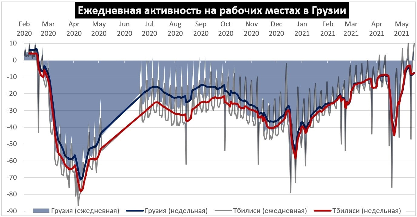 Еще один показатель снижения занятости – динамика социальной активности. Для этого мы можем использовать Google Mobility Reports для Грузии, где есть специальный субиндекс – присутствие на рабочем месте, причем есть данные как по всей стране, так и по Тбилиси. К сожалению, там нет абсолютных данных, а только относительные (отклонение от базовой линии). Рассмотрим их.