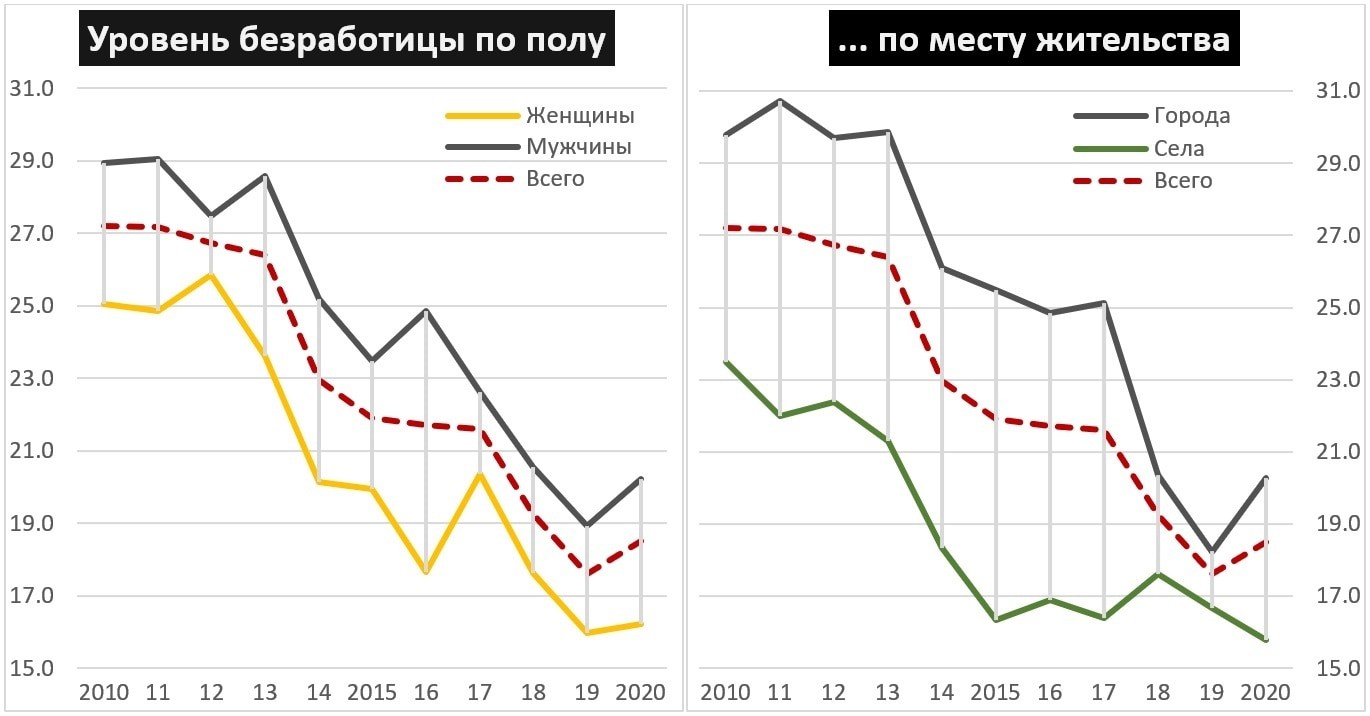 Больше всего пострадала городская занятость, особенно в сфере услуг, тогда как в сельском хозяйстве кризис практически незаметен. По полу рост безработицы более заметен у мужчин, чем у женщин. Также, от кризиса больше пострадала молодежь и люди среднего возраста, тогда как занятость у людей от 45 и старше даже выросла. Причиной этому является именно сокращение социальной активности и карантин, в меньшей степени – сокращение спроса и общий кризисный фон.