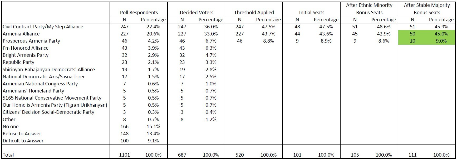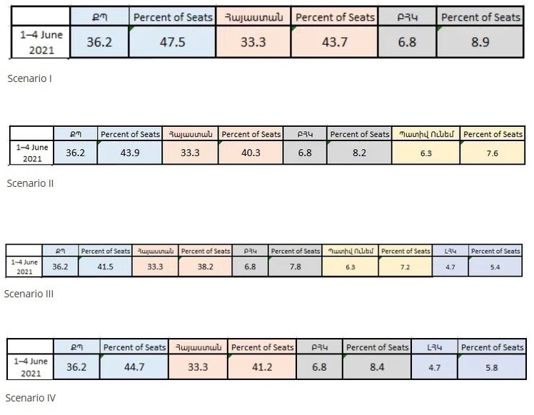 По сути, если бы выборы закончились так, как распределяются проценты поддержки избирателями двух основных субъектов, то никто в одиночку не смог бы сформировать власть. Но взамен существует возможность коалиции, которая, по оценке Арута Манукяна, скорее всего сформируется между «Процветающей Арменией» и блоком «Армения» в следующем виде (таблица 3):