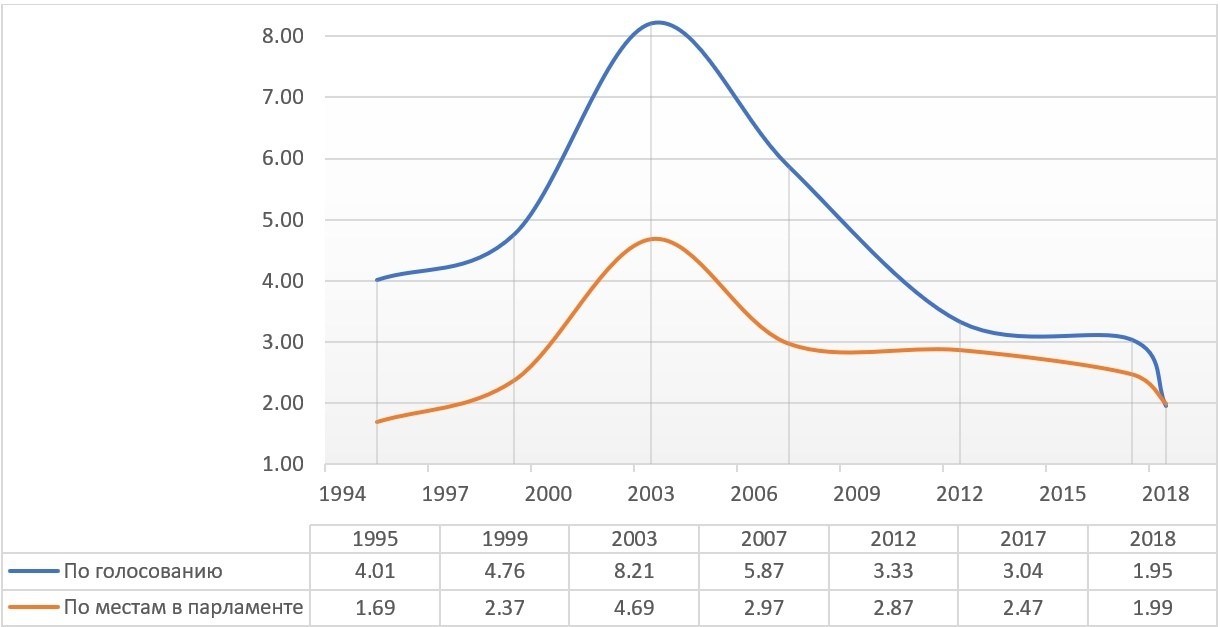 Чтобы оценить динамику концентрации голосов по результатам выборов и мандатов в парламенте, я рассчитал эффективное число партий по формуле Лааксо и Таагепера, причем как по результатам голосования, так и по распределению депутатов в парламенте. Для расчетов по распределению мест в парламенте, из числа депутатов были исключены независимые депутаты.