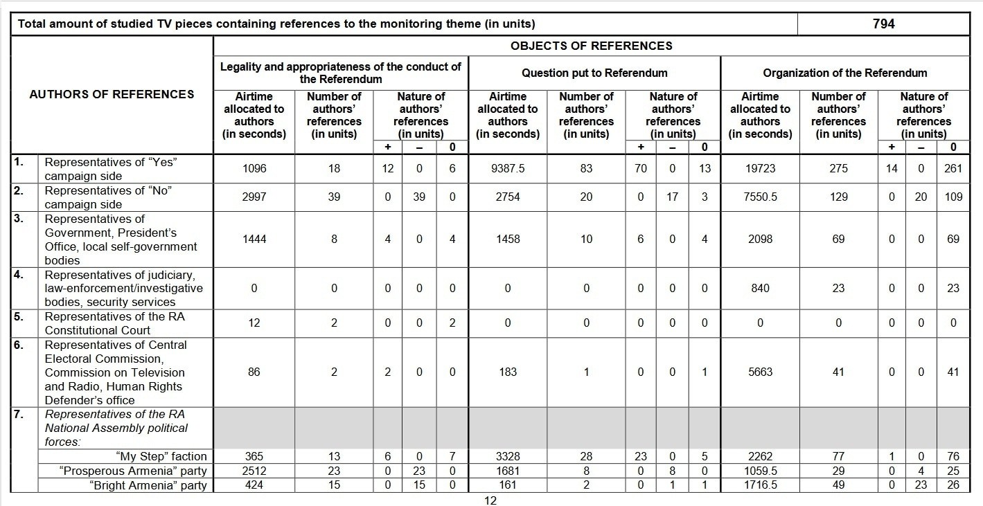 Таблица распределения вещательного времени и репортажей касательно референдума по конституционному суду. Большинство репортажей поддерживали голосование «за» и тех, кто призывал голосовать «за», и были против тех, кто призывал голосовать «против» и самой идеи такого голосования.