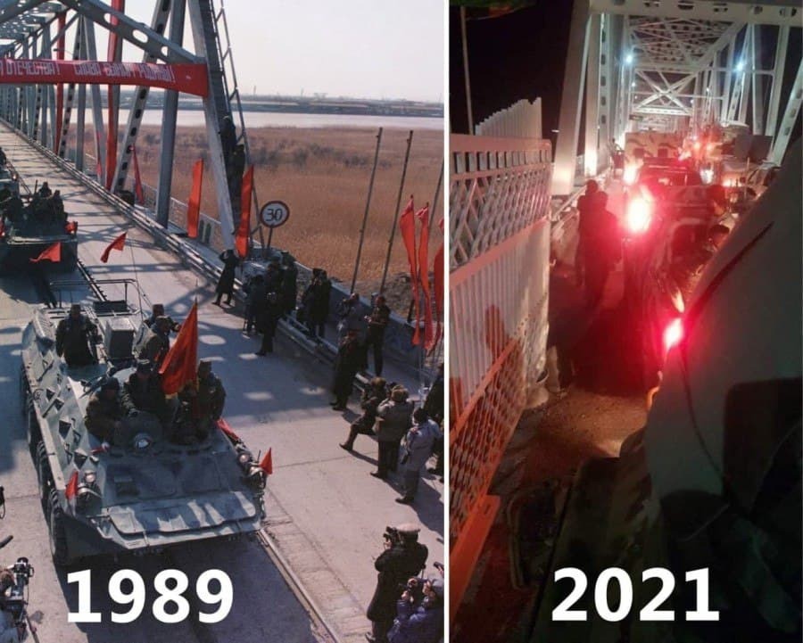 Бегство генерала Дустума и его колонны по "Мосту дружбы", ведущему в Узбекистан и открытому в 1982 году. Сравнение с выходом последней советской колонны в 1989 году.