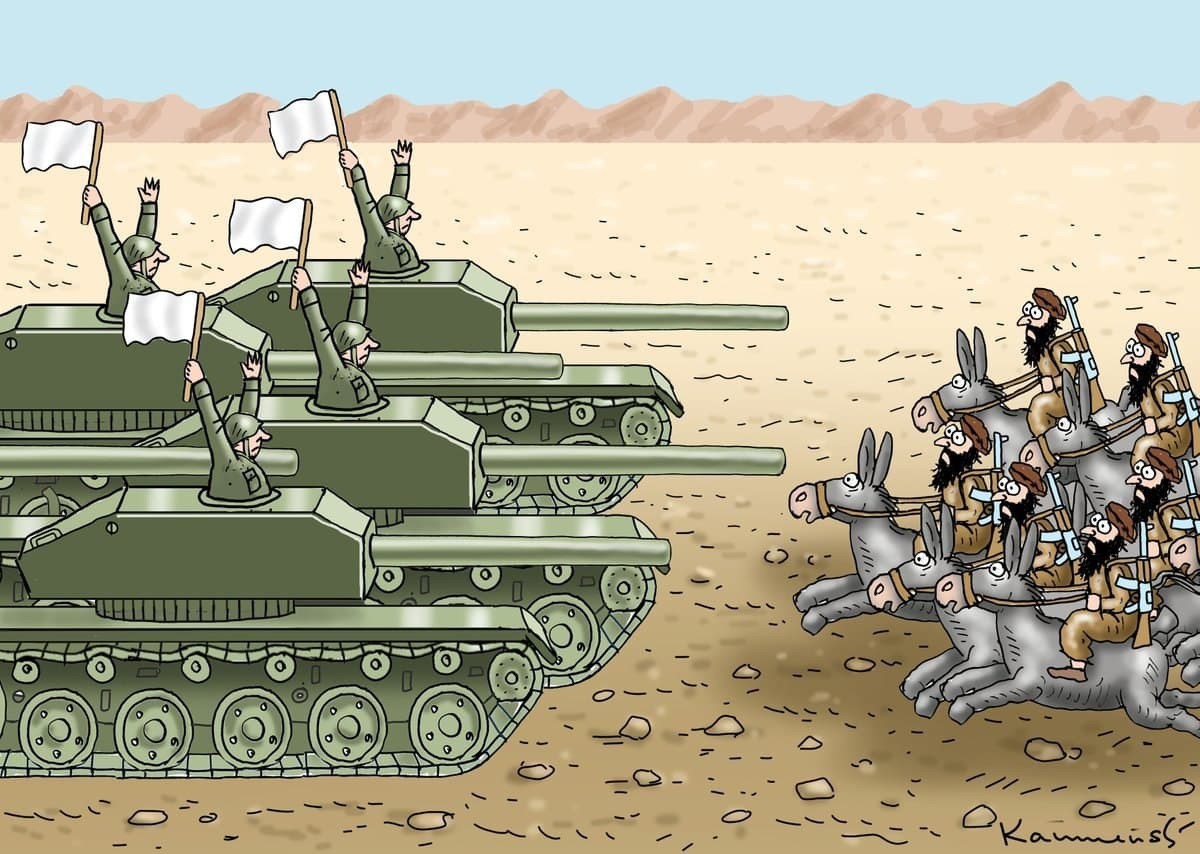 Талибан на ослах побеждает современную армию, вооруженную тяжелой техникой, поднимающую белые флаги.