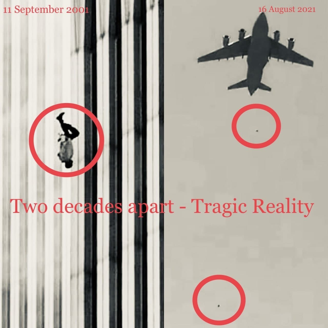 Самолет все-таки взлетел. Но несколько людей цеплялись до последнего за шасси. Впоследствии они упали и погибли. Это навеяло на сравнение с падением людей из небоскребов 11 сентября 2001 года.