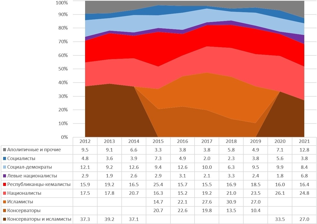 График 1. Динамика идеологических предпочтений населения Турции, 2012-2021