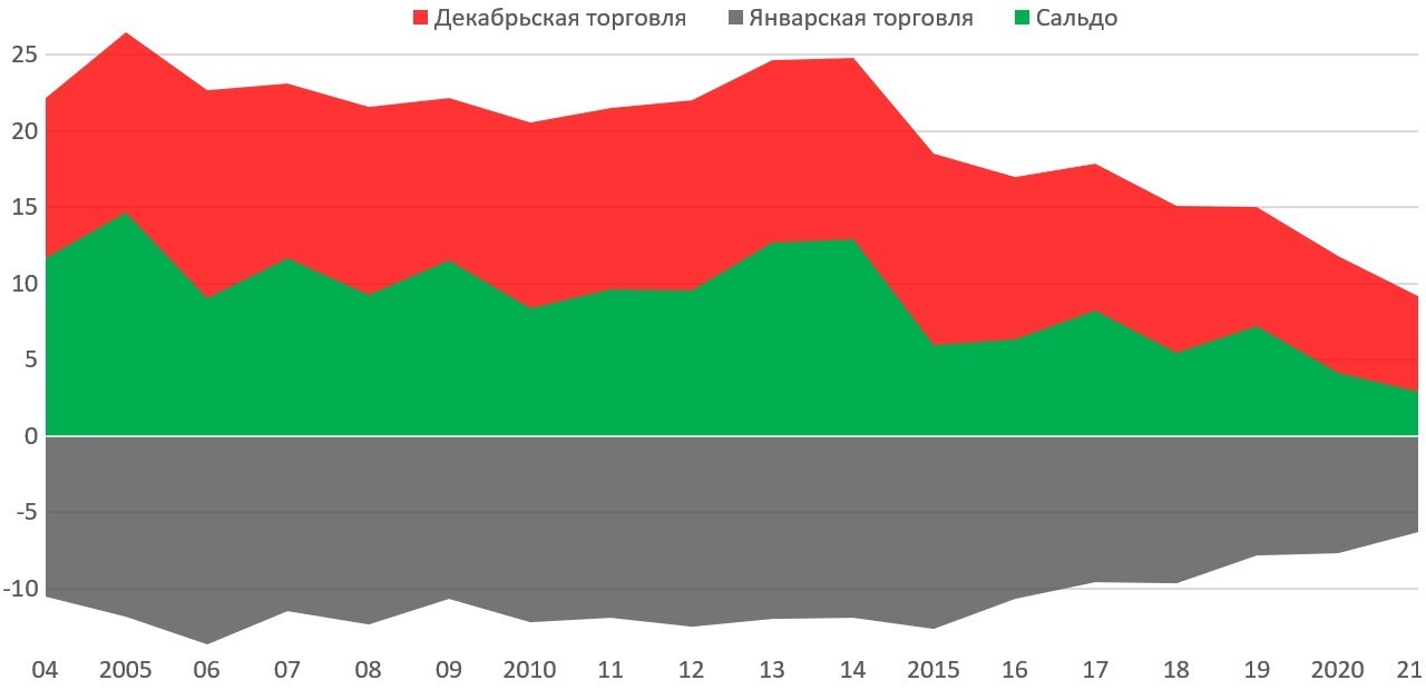 Теперь взглянем на январь. Январь совершенно точно является мертвым сезоном для торговли, и мы видим, что в январе, в пересчете на ноябрьскую торговлю, вплоть до 2015 года покупка товаров была на примерно 12 дней меньше, то есть реально торговля возобновлялась условно с 13 января, когда заканчивались запасы и заканчивались праздники. Стоит, однако, учитывать, что январь в действительности, более пассивный месяц в любом случае и эта сезонность существует и в январе. Ладно январь, но сезонность существует и в феврале, который тоже заметно пассивнее ноября: в среднем суточная торговля в феврале ниже ноябрьской на 20%. Но как бы там ни было, уменьшается «навес» торговли про запас в декабре, уменьшается и недостача в январе. Избыточная торговля на новый 2020 год снизилась до 4.2 дней, а на 2021 – до 2.9 дней. 2021 год – случай особый, учитывая поражение в войне, большинство решило просто праздник не отмечать, но взглянем на график – тренды там вполне очевидные.