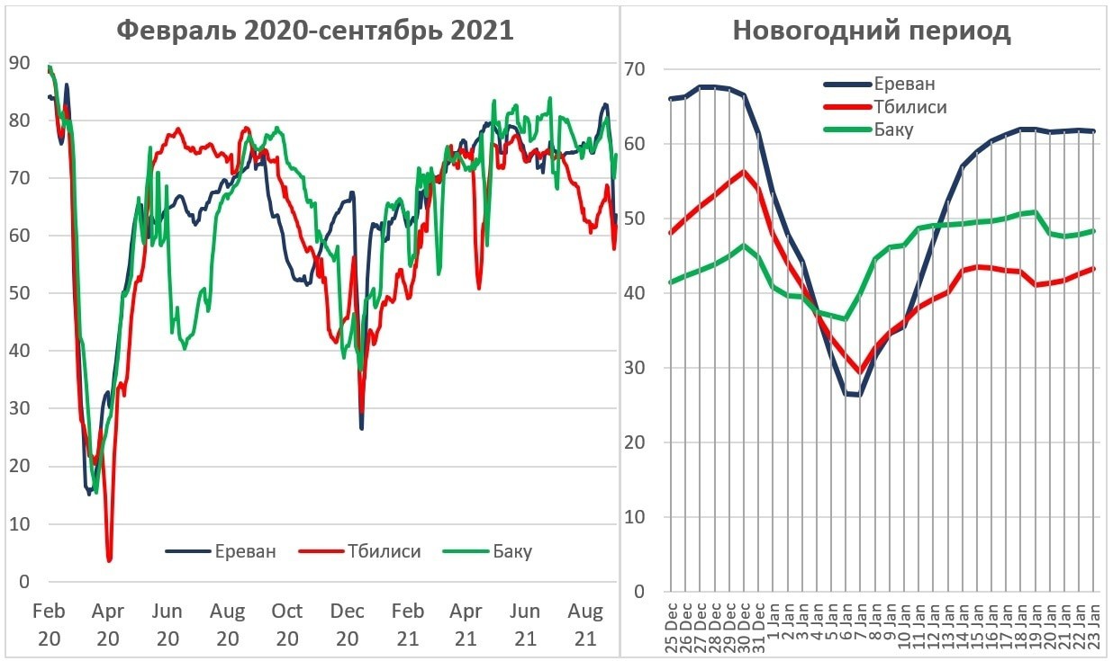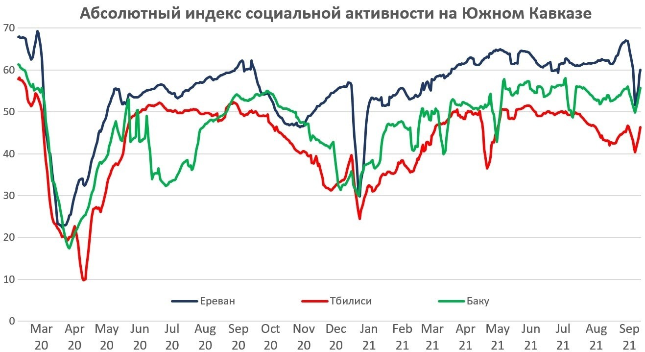 В период с 17 по 23 февраля, когда доступны первые данные и еще не было ожиданий распространения пандемии, если считать социальную активность в Ереване за 100 единиц, то в Баку она составляла 90.3 (меньше на 9.7%), а в Тбилиси 85.1 (меньше на 14.85%). В дальнейшем эти пропорции радикально не изменились, несмотря на разницу в праздниках, войну и карантины, не синхронные после мая 2020 года. За весь период с 17 февраля 2020 по 26 сентября 2021, в Тбилиси социальная активность была на 22.1% меньше, чем в Ереване, а в Баку – на 15.8%.
