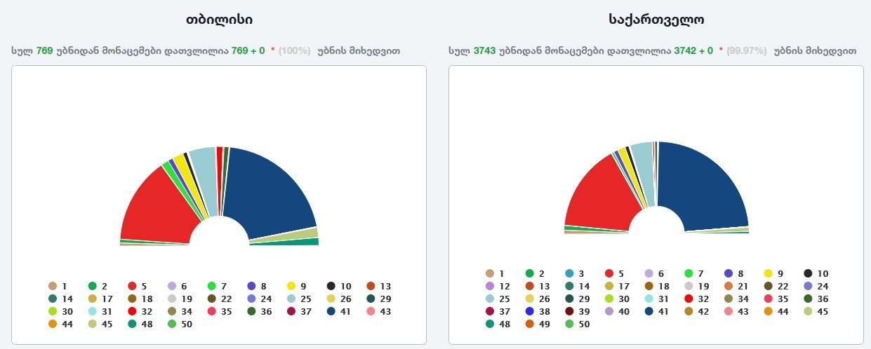 На данный момент уже подсчитаны данные со всех участков по Грузии и по Тбилиси. Результаты складываются в пользу «Грузинской мечты», уверенно лидирующей и в среднем по Грузии получившей почти 47% при почти 31% за партию «Национальное движение». Сравним имеющиеся данные с результатами экзит-полов.
