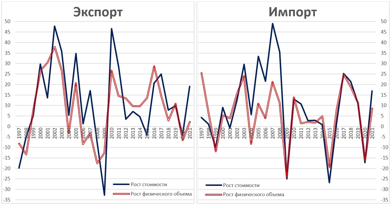 В номинальном выражении внешняя торговля Армении в отмеченный период менялась очень резко (см. график 1). В реальном выражении изменения были не столь значительными, поскольку за весь этот период дешевел доллар, росли цены на мировых рынках. При этом, цены на импортные товары росли быстрее, чем на экспортные, в особенности, это касается сырья (в первую очередь углеводородов) и продовольствия. Для этого, рассчитаем реальный рост экспорта и импорта товаров на основании дефляторов внешней торговли, доступных с 1997 года. Стоит отметить, что азербайджанское статистическое ведомство предоставляет данные о физическом объеме внешней торговли, помимо роста объема торговли в стоимостном выражении, в Армении эти данные официально не представляются, но все необходимые для их расчета исходные данные есть. Кстати, с 2017 года данные по индексу экспортных и импортных цен публикуются и в Грузии.