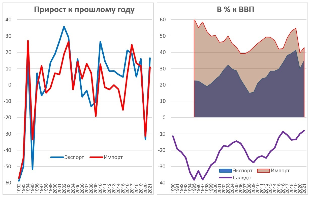 Как мы видим, динамика обоих показателей не отличалась принципиально на протяжении всех трех десятилетий, хотя отчетливо видны периоды, когда производство росло с опережающими темпами (что выражалось в более высоких темпах роста экспорта), и когда росло потребление (более высокие темпы роста импорта). Приблизительно объем экспорта и импорта товаров и услуг за последние 30 лет в сопоставимых ценах 2021 года можно оценить следующим образом.