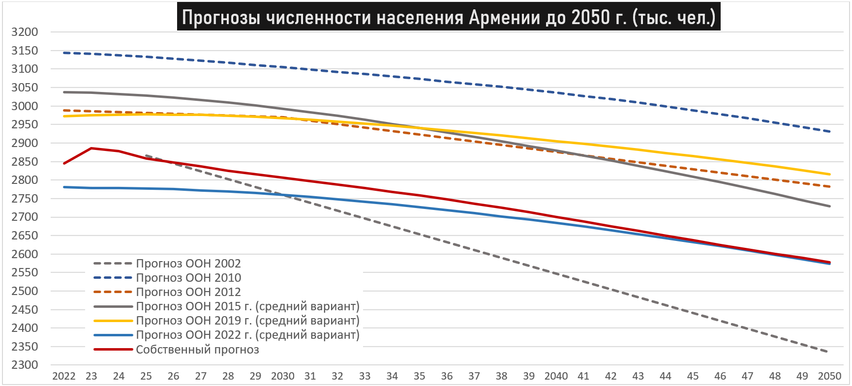 Как мы видим, во всех прогнозах ООН относительно Армении за последние 20 лет (на графике не приведены прогнозы середины-конца нулевых, чтобы его не перегружать) предполагалось поэтапное снижение населения, постепенно ускоряющееся к IV десятилетию XXI века. Однако наиболее резкое падение предполагалось по прогнозу 2002 года (есть только две точки – за 2025 и 2050 гг.). Относительные демографические успехи Армении в дальнейшем повлияли на то, что в дальнейшем предполагалась более благоприятная динамика, а по прогнозу 2019 года предполагался даже рост вплоть до 2030 года. Но в тех прогнозах было очень много неточностей в исходных положениях и, хотя в деталях и нынешний прогноз ООН содержит много неточностей, но они друг друга компенсируют таким образом, что расхождения с моим прогнозом (более детально учитывающим обстоятельства Армении) стали минимальными.