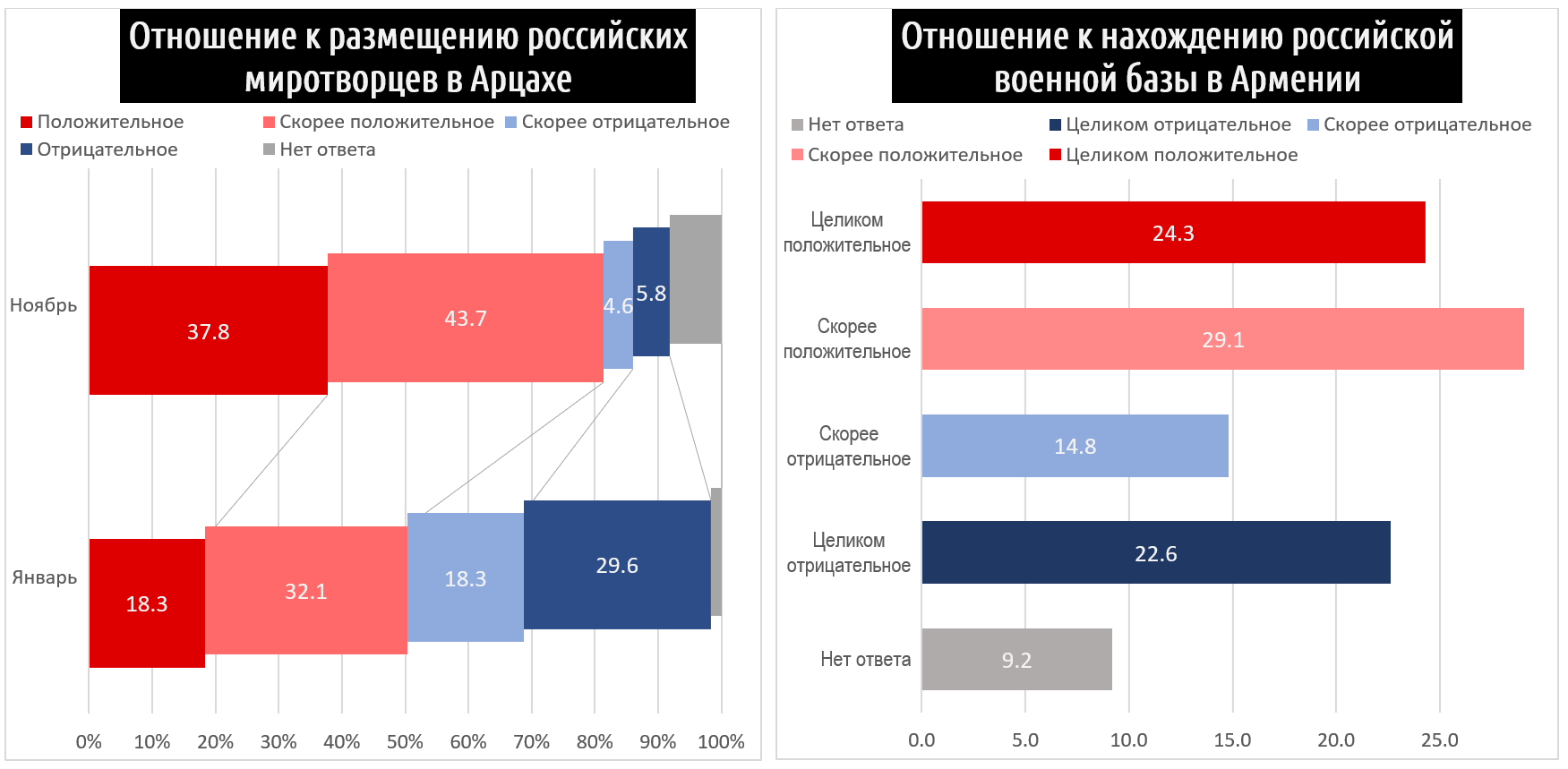 А вот отношение к российскому военному присутствию в Армении и Арцахе резко изменилось в последние месяцы на фоне объективной или субъективной неспособности миротворцев защитить население Арцаха – если до начала блокады размещение миротворцев поддерживали 81.5%, а сейчас это число упало до 50.4%. Что касается 102 российской базы в Гюмри, то ее присутствие поддерживают 53.4%, а против – 37.4%. Скорее всего, здесь такая же динамика – резкий слом в течение всего лишь пары месяцев.