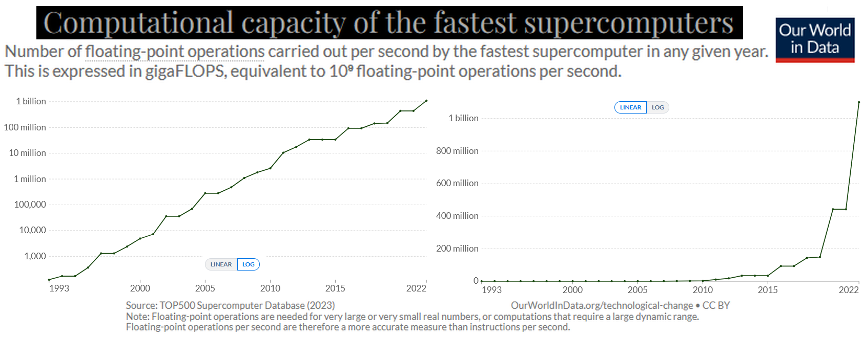 Еще немного на тему: вычислительная мощность самых мощных суперкомпьютеров - скорость прогресса изображенная на линейном и логарифмическом графике