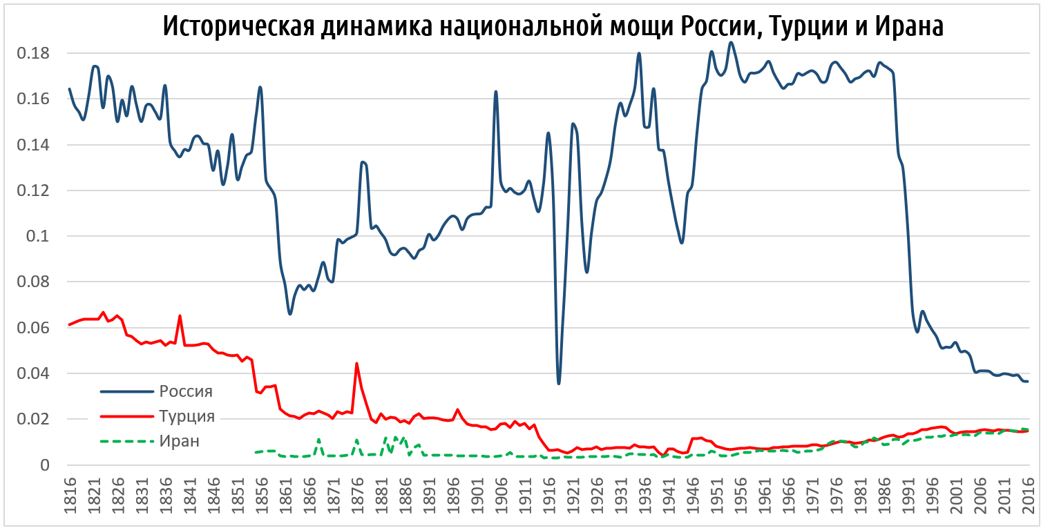 В России ситуация была другой - преемственность элиты очень условная, и видение отдельных элитных групп не превращается в общегосударственный консенсус. Поэтому, каждый раз политика изменяется очень сильно. Но любая российская элита исходила из того, что демонстрация геополитических амбиций - это вопрос ее выбора; российские элиты не считали себя проигравшими после войн, в том числе, Холодной войны, и осознание исторических трендов там было совсем другим, потери считались допустимыми и обратимыми, а масштаб замыслов был гораздо выше. Российская элита в своем восприятии по-прежнему борется за мировое господство, и сама эта борьба выглядит важнее ресурсного обеспечения. И это (по сути, низкое качество российской элиты) является главной причиной относительного движения Турции вперед, поскольку, опять же, речь идет в большей степени об уменьшении российского влияния, чем о росте турецкого. В качестве бонуса, можно взглянуть на исторические тренды соотношения национальной мощи Турции и России за последние 200 лет.