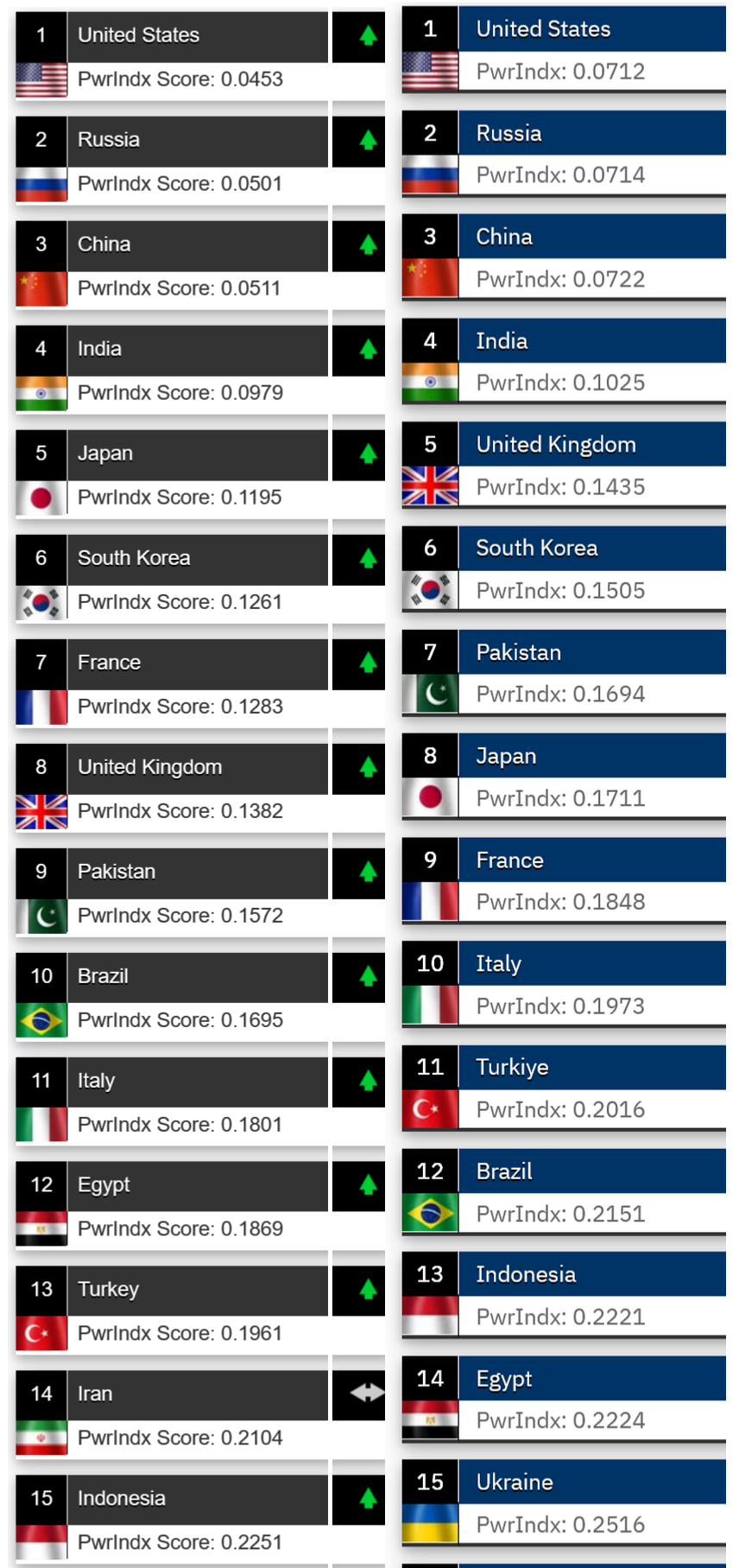В этой связи интересно и то, как оценивается российская военная мощь. Существует рейтинг Global Firepower, в котором оценивается огневая мощь армий мира. В частности, США занимают первое место, Россия второе, Китай - третье. Чем ниже значение огневой мощи, тем лучше. Так вот, даже по сравнению с 2022 годом, относительное отставание Турции от лидеров рейтинга, в т.ч. России, заметно сократилось.