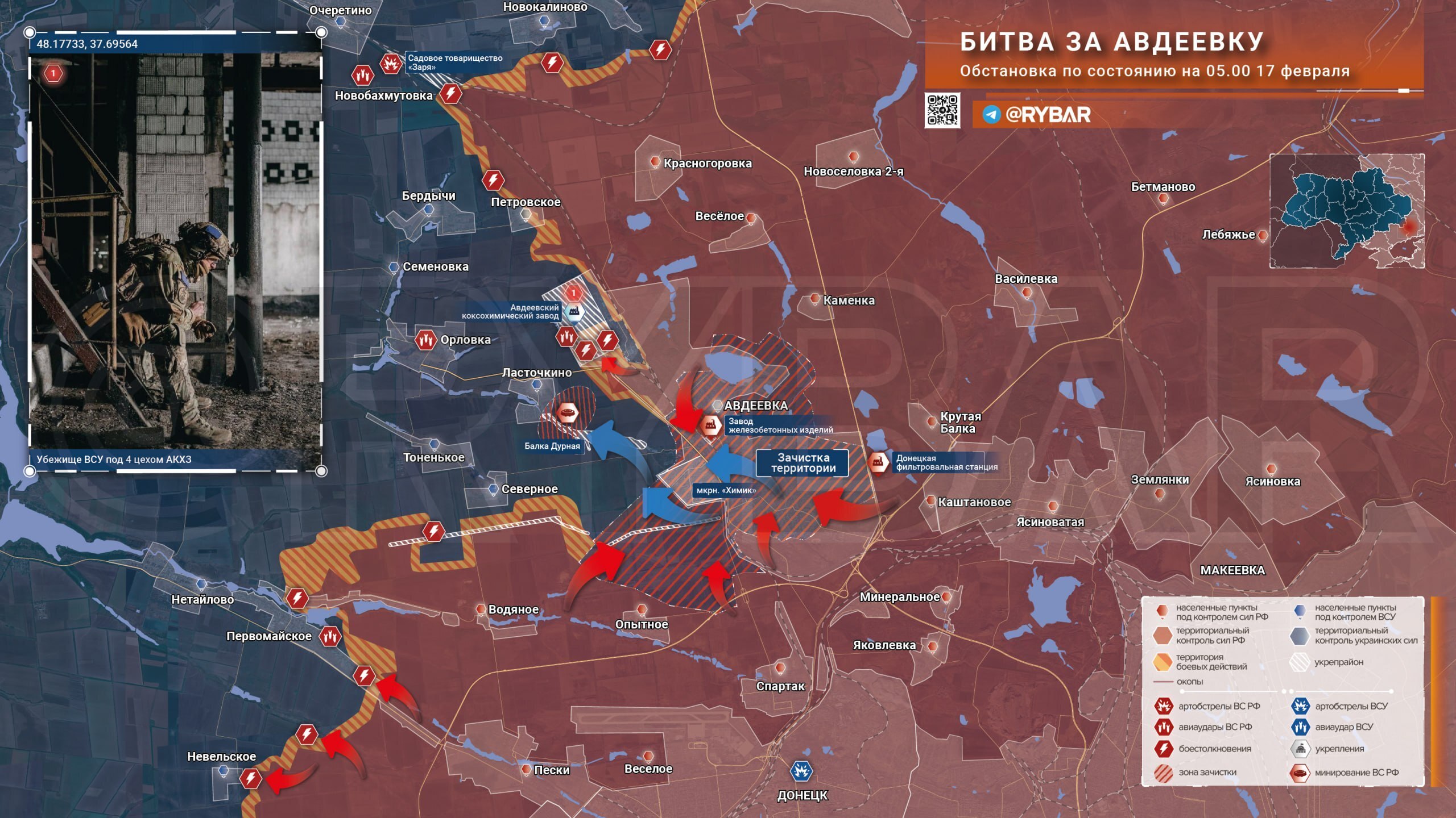 К началу февраля стало понятно, что Украина Авдеевку не удержит даже ценой больших людских потерь и возникли споры о том, что делать: либо держаться до конца, либо вовремя выходить, поскольку Авдеевка все равно уже потеряла свое стратегическое значение. Зеленский придерживался варианта бороться до конца, а Залужный предлагал вовремя выйти. Учитывая, что россияне смогли перекрыть дороги по снабжению Авдеевки, а украинские силы были разделены на несколько анклавов, началось бегство с позиций, чтобы успеть до того момента как окончательно захлопнется крышка котла. И тем не менее, выход из Авдеевки очень напоминал события, известные как Изваринский, Иловайский и Дебальцевский котлы. Было брошено много раненых, впоследствии попавших в плен, а при отступлении, по российским оценкам, было потеряно 2.4 тысячи солдат ВСУ, потеряна техника, а в самой Авдеевке и ее укреплениях брошены склады с вооружением.