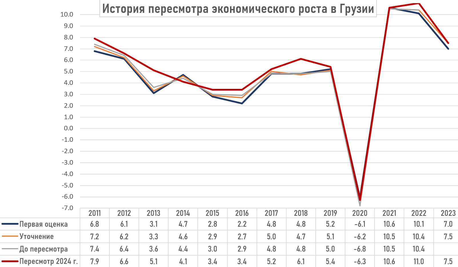 Вообще предварительные данные по определению неполны. Некоторая информация поступает с запозданием, поэтому уточнение почти неизбежно приводит к повышению роста. Но иногда уточнение приводит и к обратному эффекту – если уточнение коснулось цен, а цены выросли больше, чем раньше ожидалось. Еще одно обстоятельство: Грузия перешла с СНС-93 на СНС-08 в методе подсчета ВВП, что увеличивает общий размер ВВП на несколько процентов благодаря досчетам и оценкам экономики домашних хозяйств, аренды и криминальной экономики. Более того, если предположить, что все эти сектора растут опережающими темпами, то это приведет к постоянному более высокому росту, чем по старому методу. Но при этом корреляция со старыми показателями должна сохраняться (как, впрочем, и было до последнего пересмотра). Переход на СНС-08 произошел, если мне память не изменяет, в 2018 году, и с тех пор были пересчитаны показатели 2010-ых гг., а новые показатели уже рассчитывались только по новой системе.