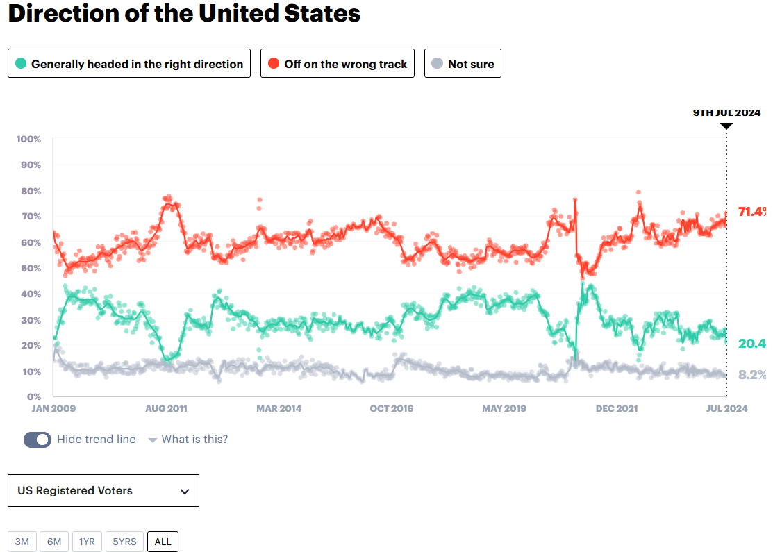 Америке все труднее сохранять былые позиции – с одной стороны, конкуренты наступают на пятки, с другой – сам Байден и его команда не готовы принять объективную тенденцию сокращения американского влияния. Это заводит Америку в тупик, в результате чего его все чаще и все более обоснованно сравнивают с Брежневым (параллелей действительно много). Как следствие, сейчас наблюдаются рекордно высокие показатели недоверия системе и государственному курсу США. Согласно трэкеру YouGov, 71.4% американцев считают, что страна идет «не туда» и лишь 20.4% считают, что страна развивается в верном направлении. Среди независимых избирателей (не республиканцев и не демократов), соотношение еще хуже, 78% на 13%.