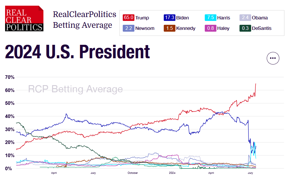 По мнению букмейкеров Real Clear Politics, фаворитом президентской гонки является Трамп. Он вырвался вперед с осени 2023 года, когда его конкурент из числа республиканцев Рональд Де Сантис сдал в ходе отсева в рамках Республиканской партии. В июне 2024 года, шансы Трампа на победу оценивались в 50+%, а Байдена – в треть. Причем эти оценки довольно уверенно росли. После дебатов Трамп продолжил прибавлять, а вот Байден резко сдал. Прямо за день перед стрельбой шансы Трампа оценивались в 56%, а Байдена – в 14% (и еще 16% - шансы Камалы Харрис). Сейчас эти шансы еще больше выросли. А OddsChecker в начале июля давал на победу Трампа 1.62 к 1, а на победу Байдена 8 к 1 (Камала Харрис – 5.5 к 1).