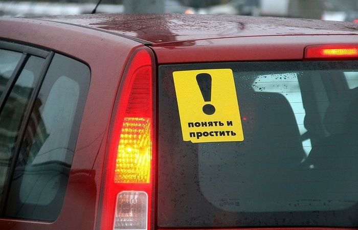 У автомобилистов принято навешивать на стекло наклейку с восклицательным знаком. Говорят есть даже такой закон: " за отсутствие восклицательного знака на машине начинающего водителя предусмотрен по закону штраф в размере 500 рублей."