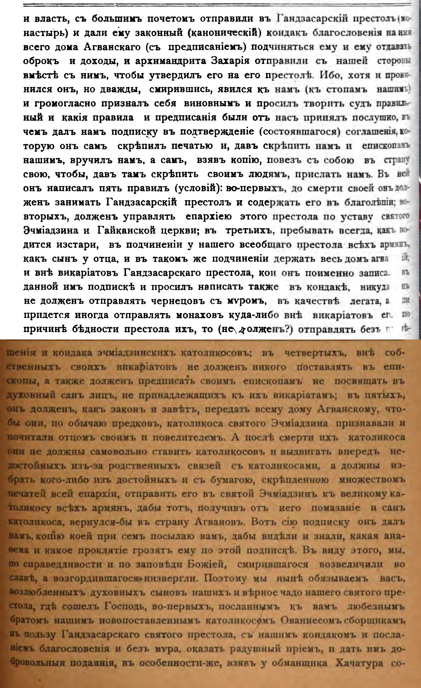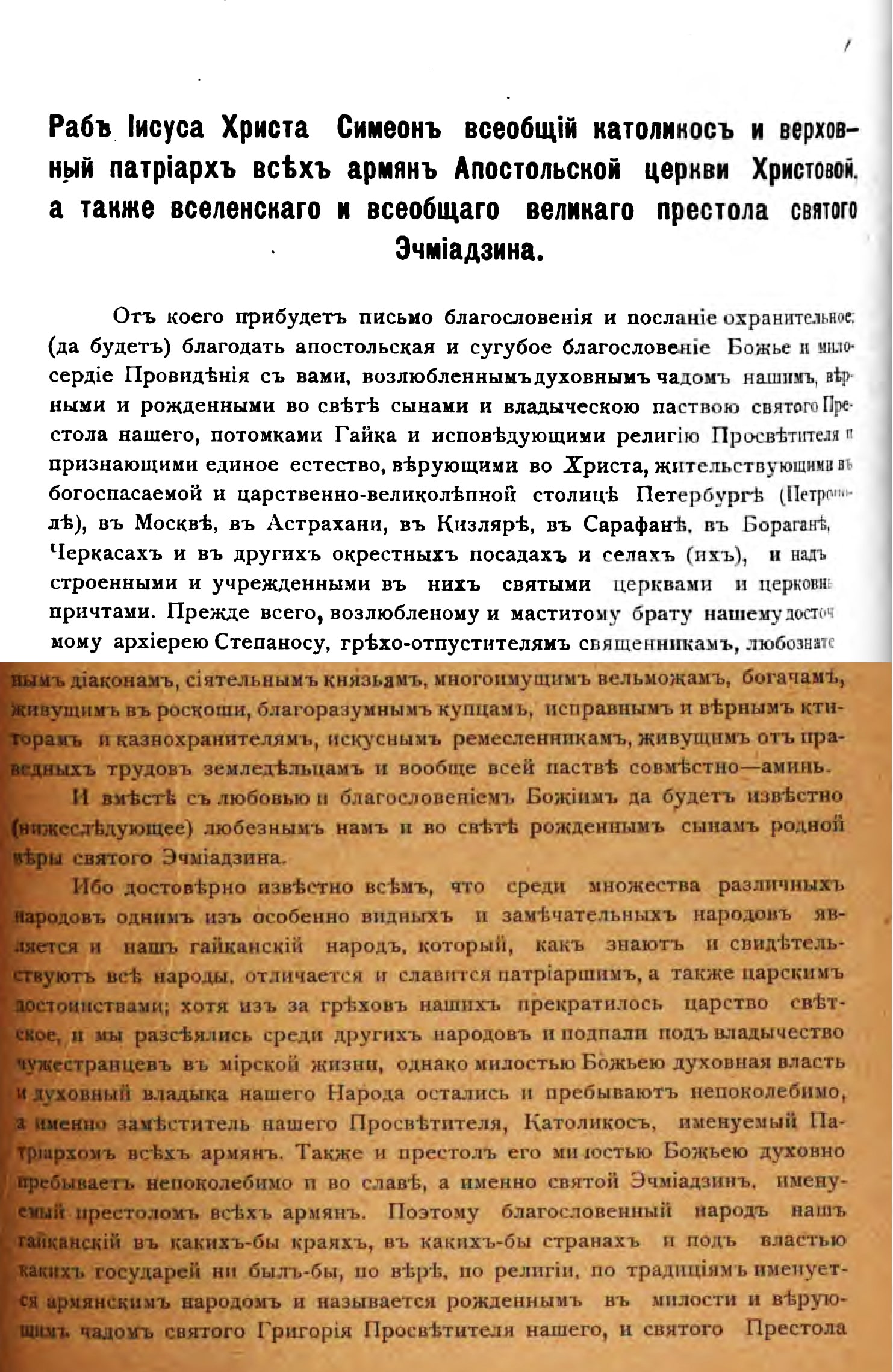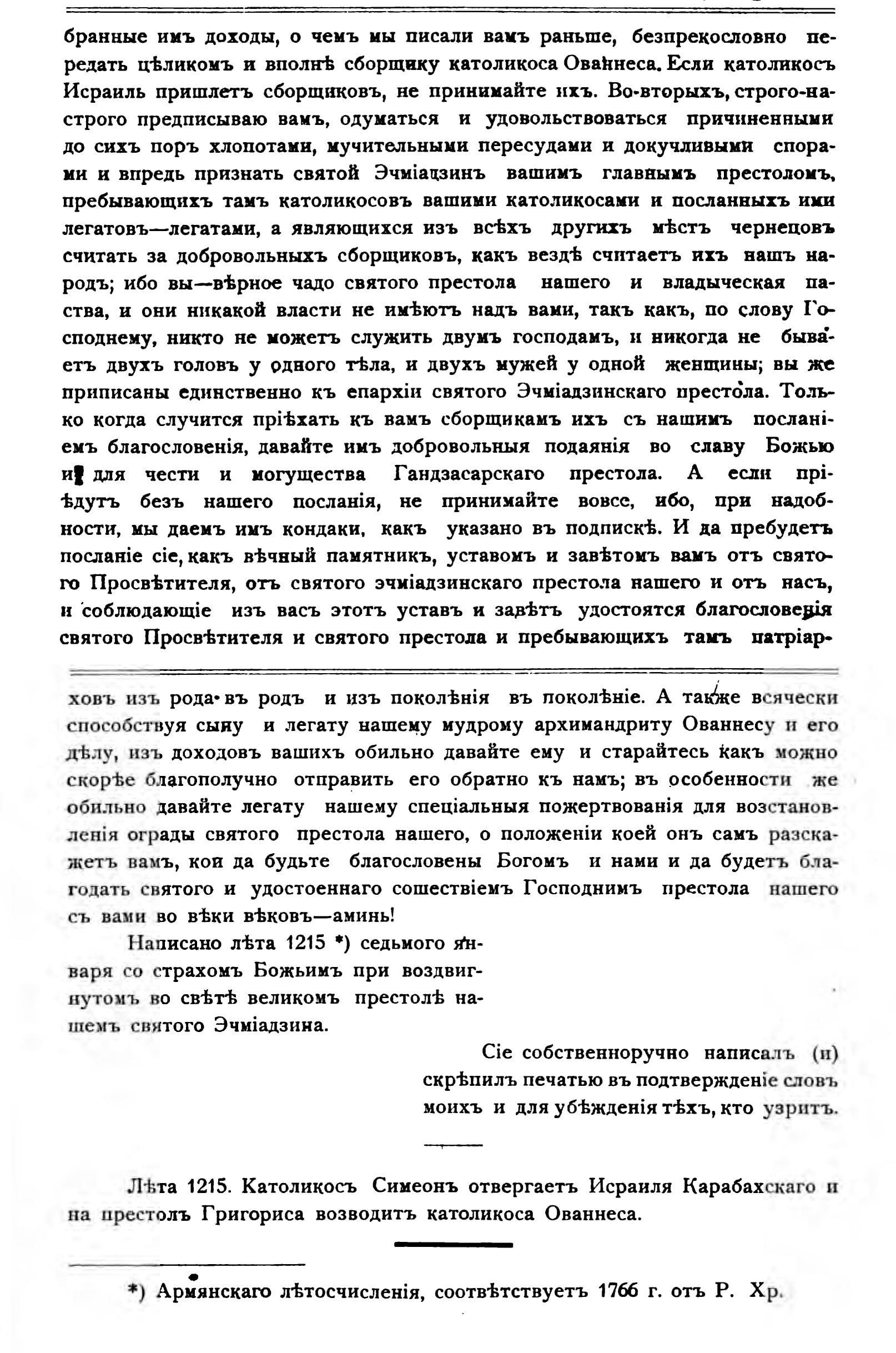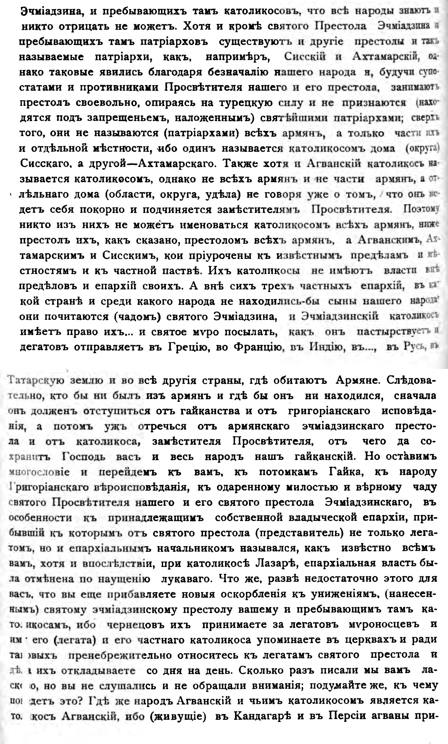 Приведу текст ответа католикоса всех армян Симона, который я скопировал из журнала "Кавказский вестник" N 10, октябрь 1901 год. Ответ датируется 1766 годом. Прочитать текст несложно