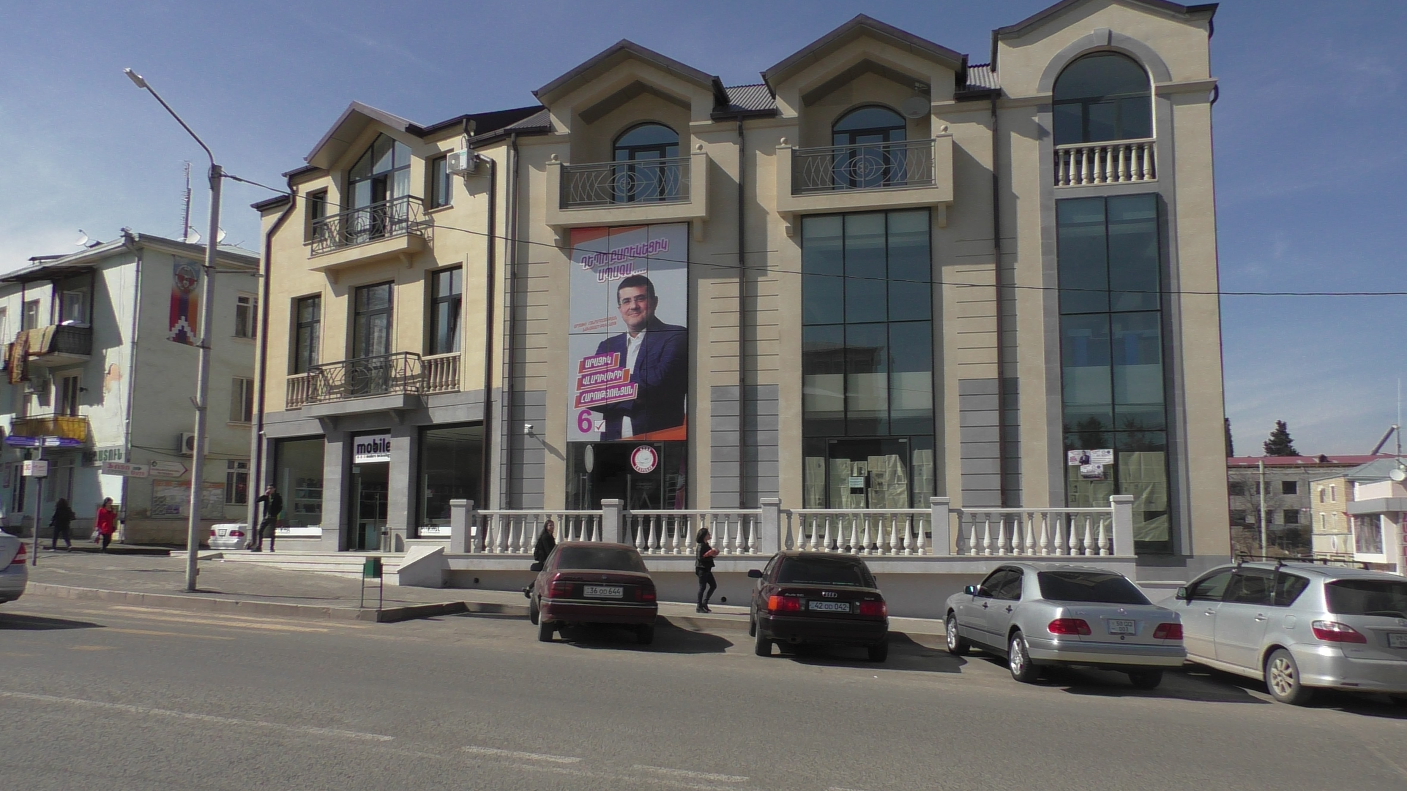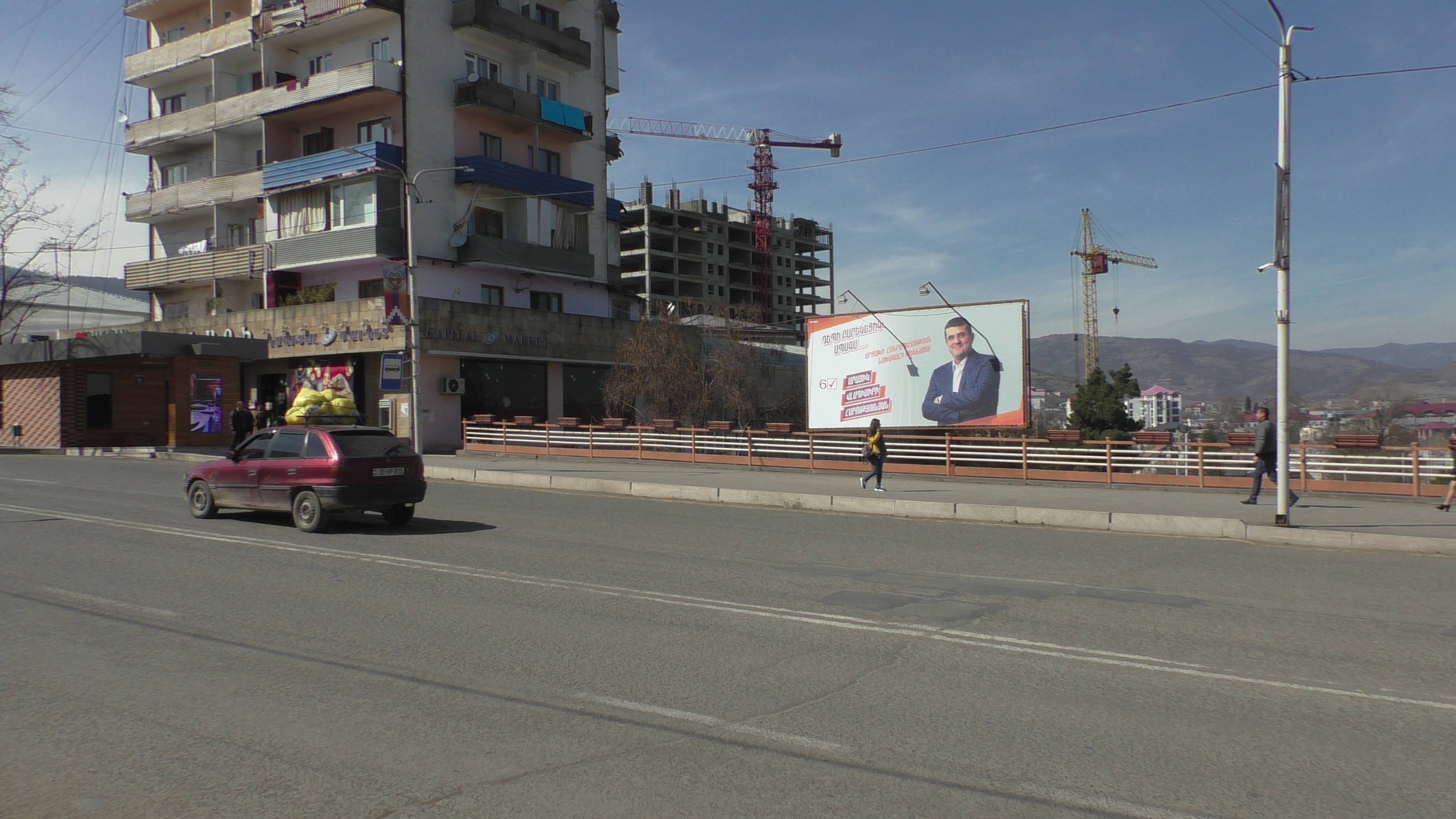 Больше всех денег у Араика Арутюняна, соответственно его плакат самый большой. Это рядом с вокзалом. Наши таксисты в своем большинстве за него, верят, что он станет президентом и улучшит жизнь всех жителей Арцаха. Интересно, если вдруг станет президентом, вспомнит ли о таксистах?