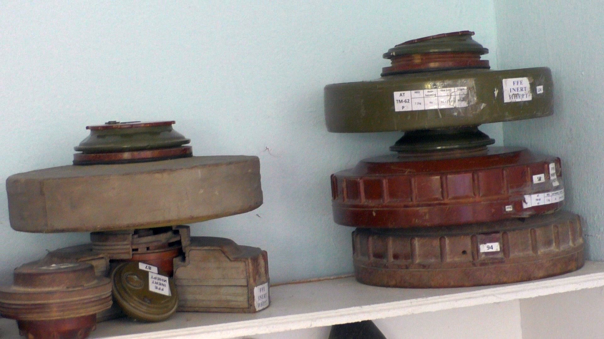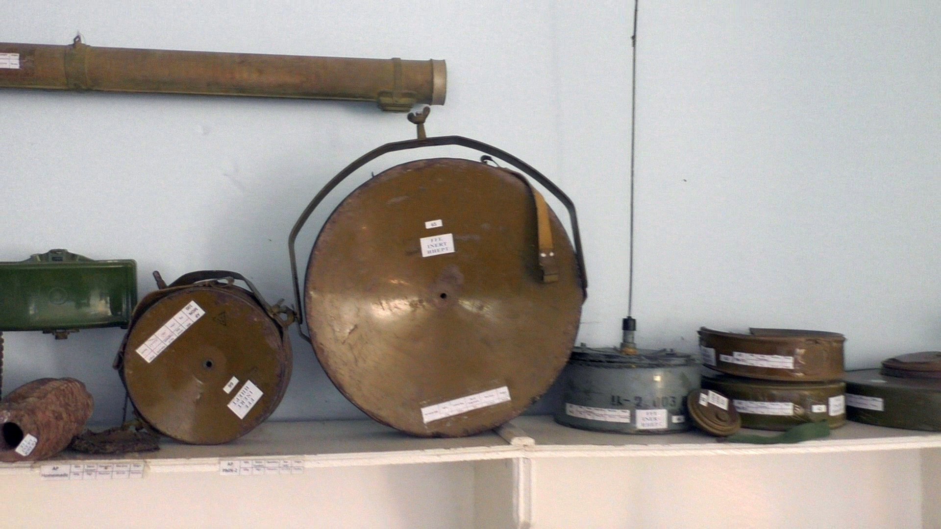 Противопехотные мины, третья слева знаменитая "Лягушка" ОЗМ-72. Ее так назвали, потому что она выпрыгивает из земли на метр в высоту, потом взрывается, поражая своими смертоносными шариками-осколками все живое в радиусе 30 метров, но разлет осколков намного больше...