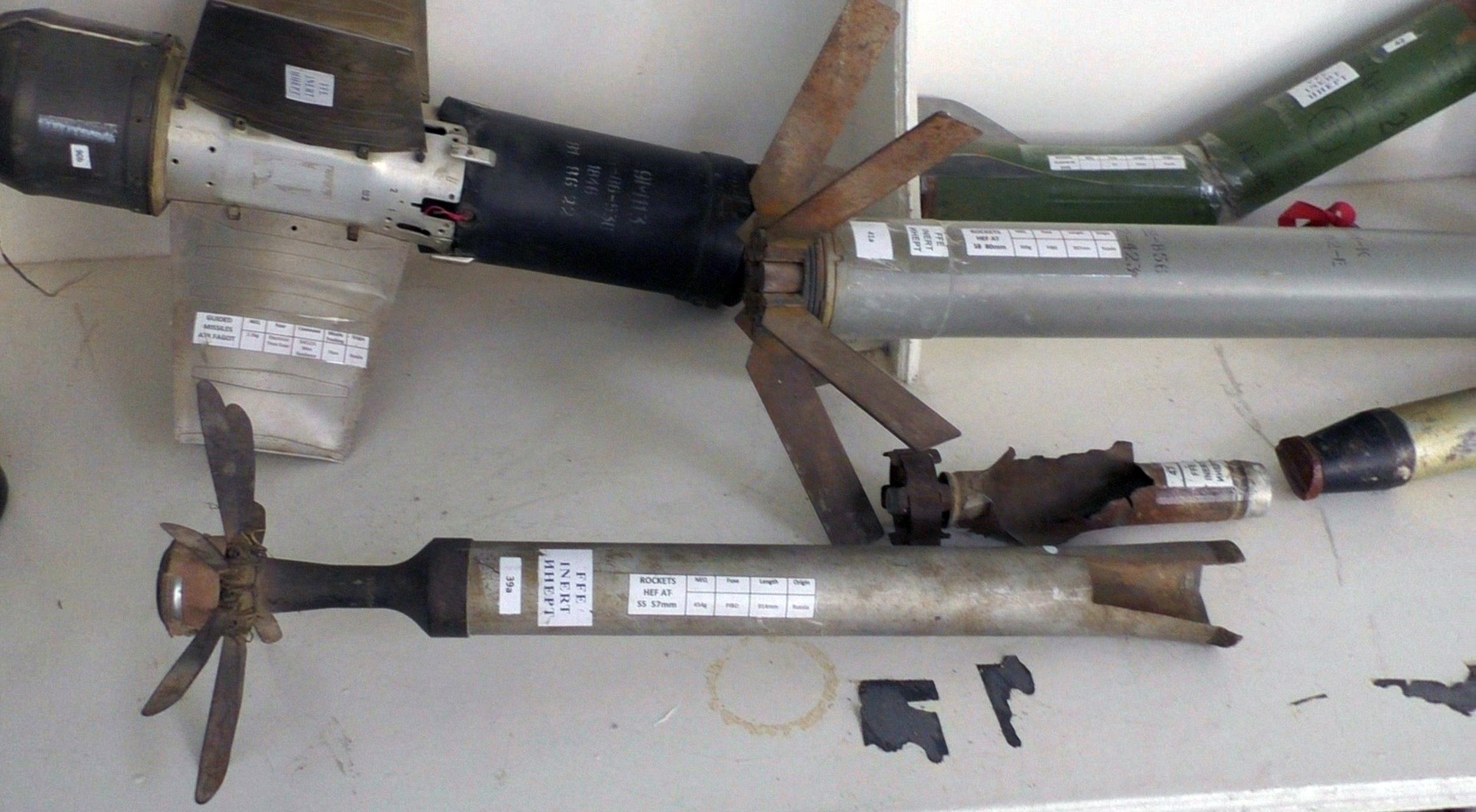 Гранаты противопехотные и противотанковая, крупнокалиберные патроны, выстрел для гранатомета. Зеленый кожух от одноразового гранатомета, так называемая "Муха".