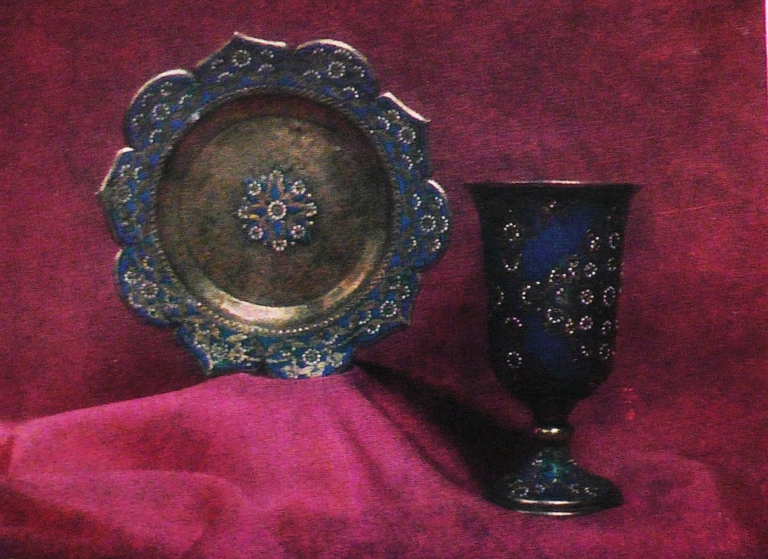 К сожалению, никакой информации о мастере Бадаме в интернете я не нашел, но в той же книге есть и фото других его работ, исполненных в том же стиле. Серебряная чаша и блюдце покрыты темно-синей эмалью с растительным орнаментом.