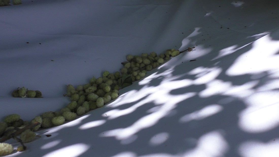 Ветер раскачивает ветки тутового дерева и спелые белые ягоды падают в эти паруса. Да и без ветра самые спелые падают. Дерево шелковицы растет прямо у лестницы, раскинуть под ним большую шаль нет никакой возможности, вот и заменил несколькими маленькими.