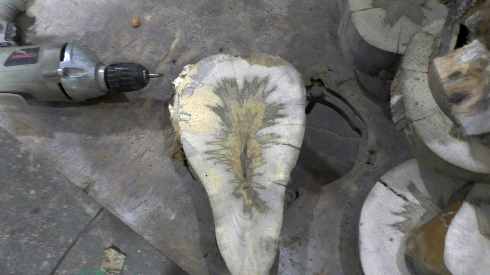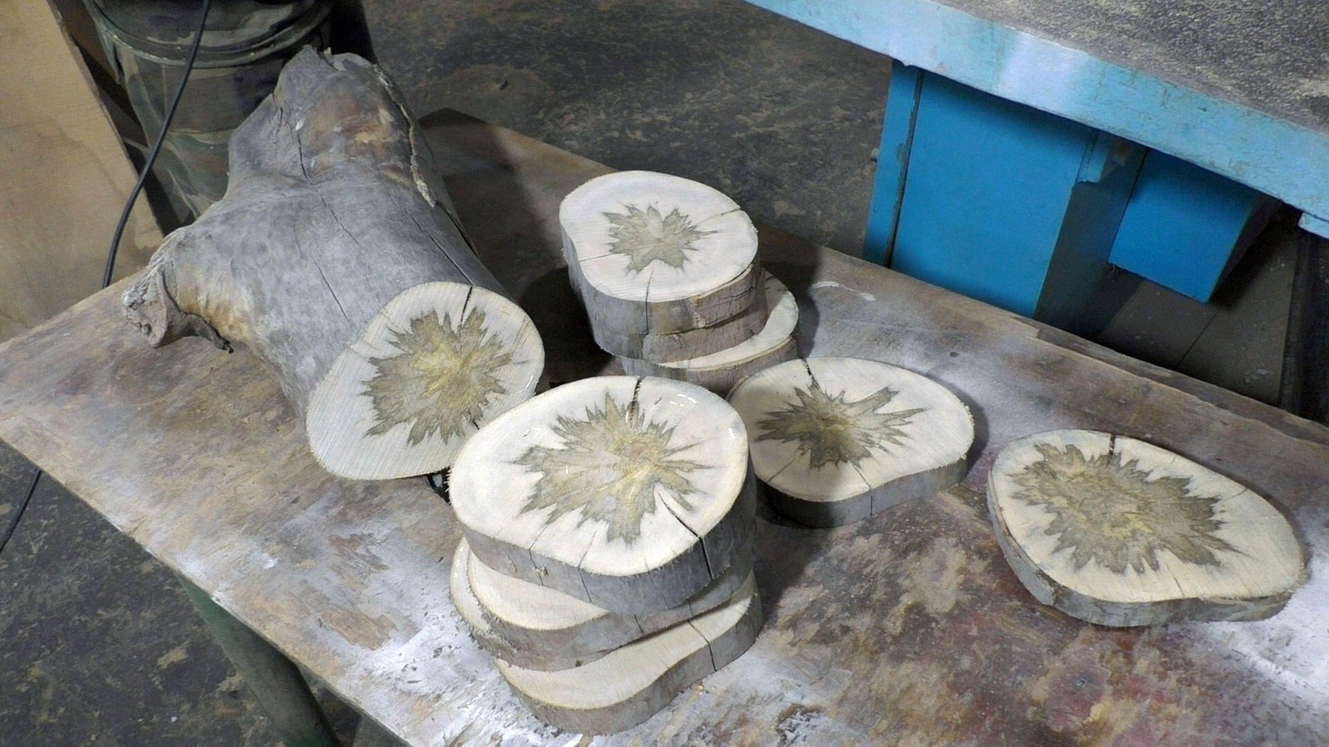 Эти бревна попались мне под руку еще в 2017 году, когда я работал в приграничной зоне. Бензопилой резал сухие деревья, дровами на зиму запасался и вдруг на одном бревне заметил узор, похожий на кленовый лист. Половину дерева разрезал бензопилой, как колбасу и раздал друзьям, как сувенир. Многим понравилось.