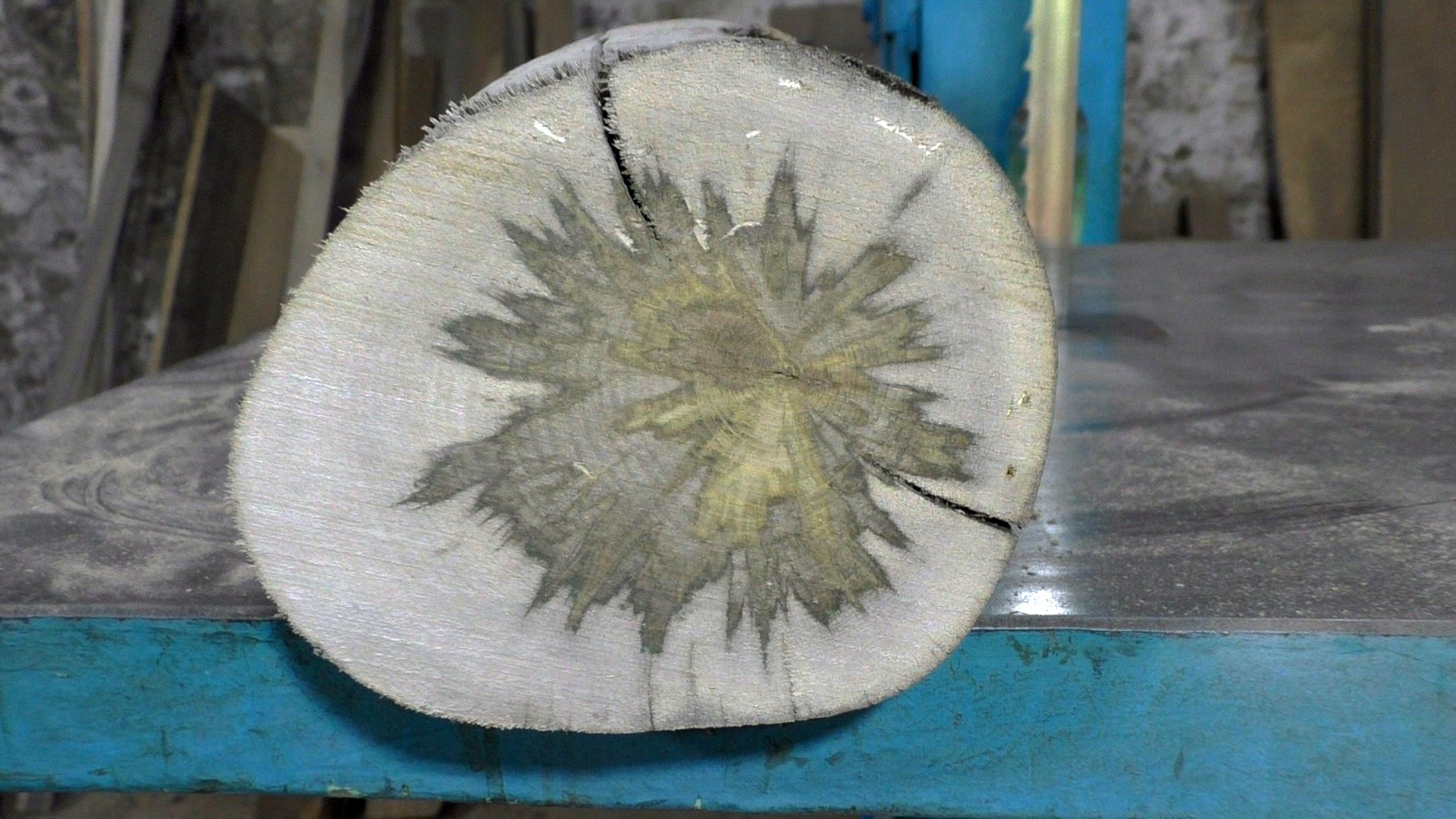 Дефект был в том, что разрез бензопилы получался неровным, поэтому другую половину разрезал надвое и привез домой, чтобы потом уже, аккуратно разрезать на станке. Жаль такую красоту сжигать, а это потом растянулось почти на три года.