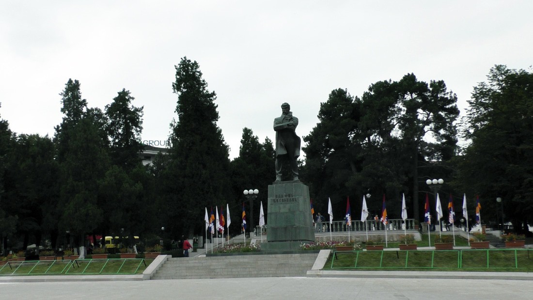 За памятником Шаумяна выстроились флаги Республики Арцах и города Степанакерта, видимо, намечается очередной праздник.