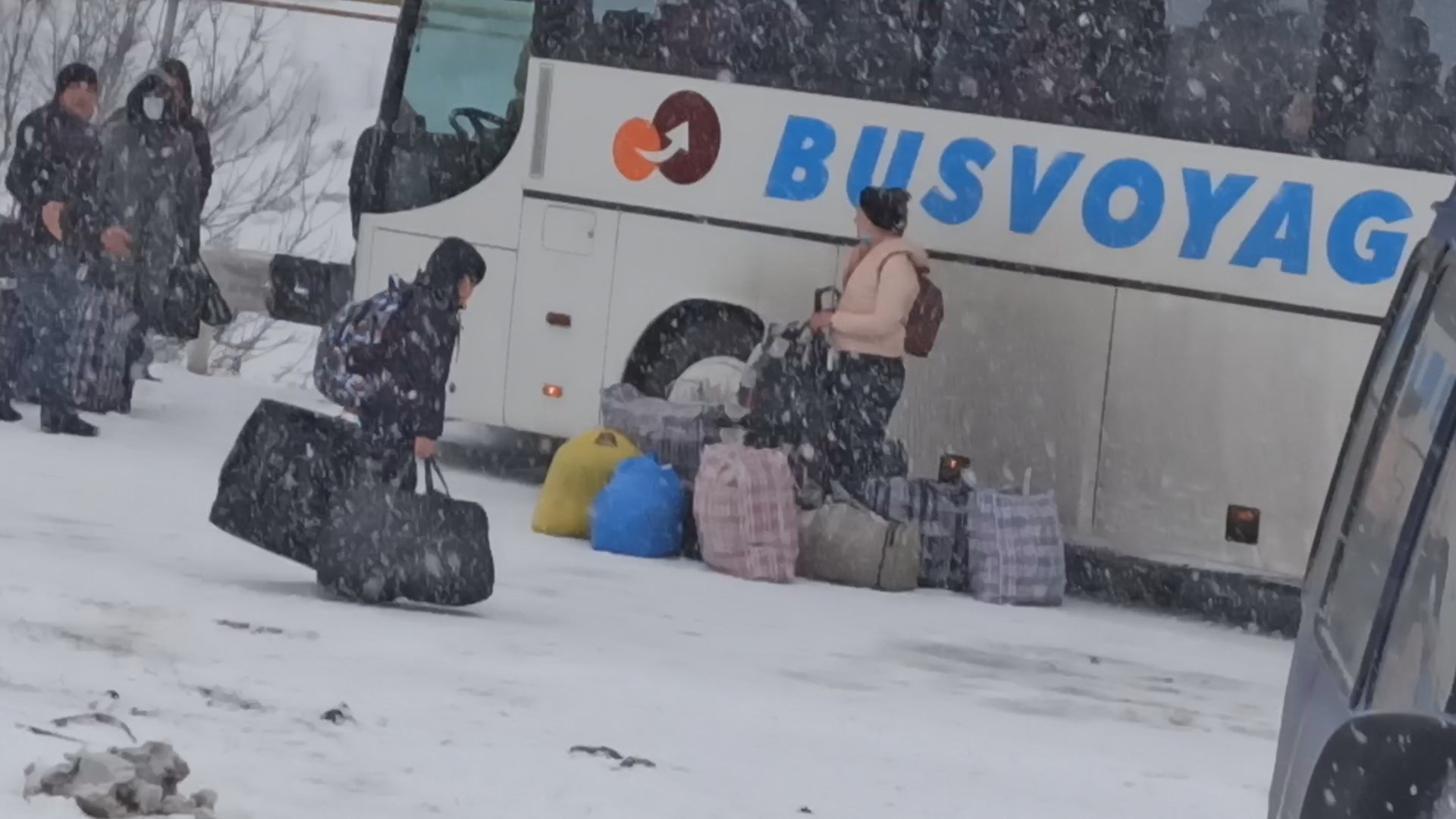 Снег стал испытанием и для тех, кто оказался на дороге, а таких людей немало, народ возвращается автобусами из Еревана в Степанакерт.