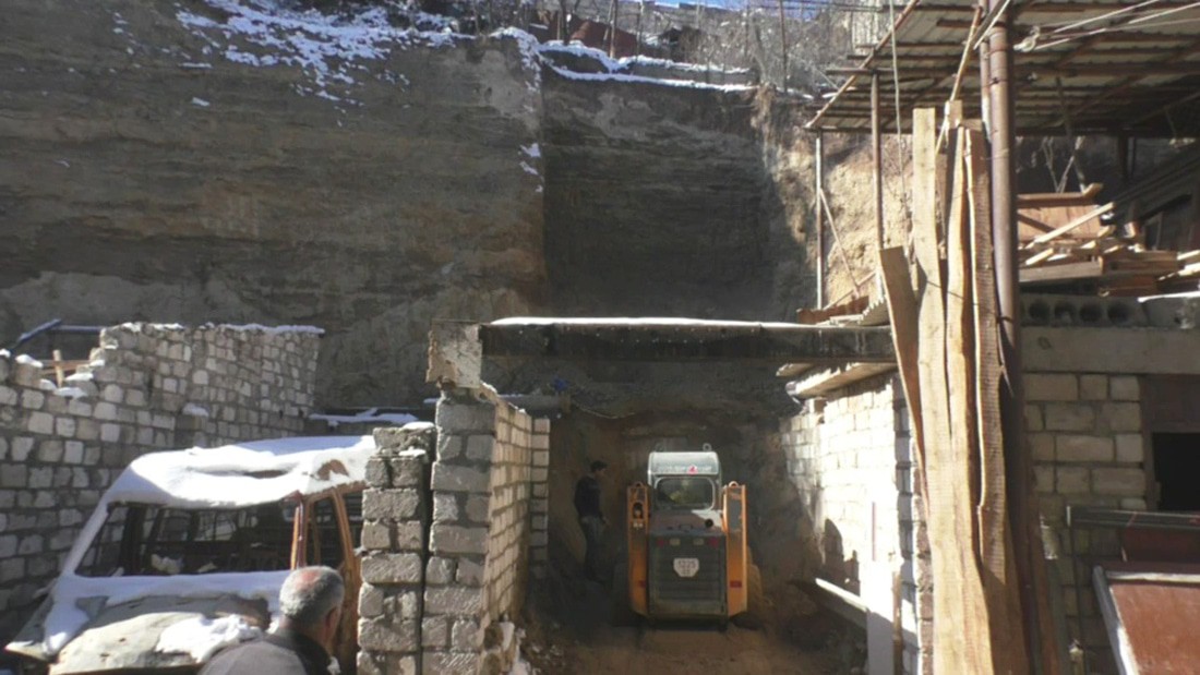 Сын Артура занят постройкой гаража во дворе, но для этого приходится выгрызать у горы свой участок. Верхнюю часть горы выдолбил вручную, перфоратором, туда ковш не дотягивается, а вот внизу помогает юркая техника. И такие есть люди, не сидят и плачут, а живут, работают и строят, даже сейчас...