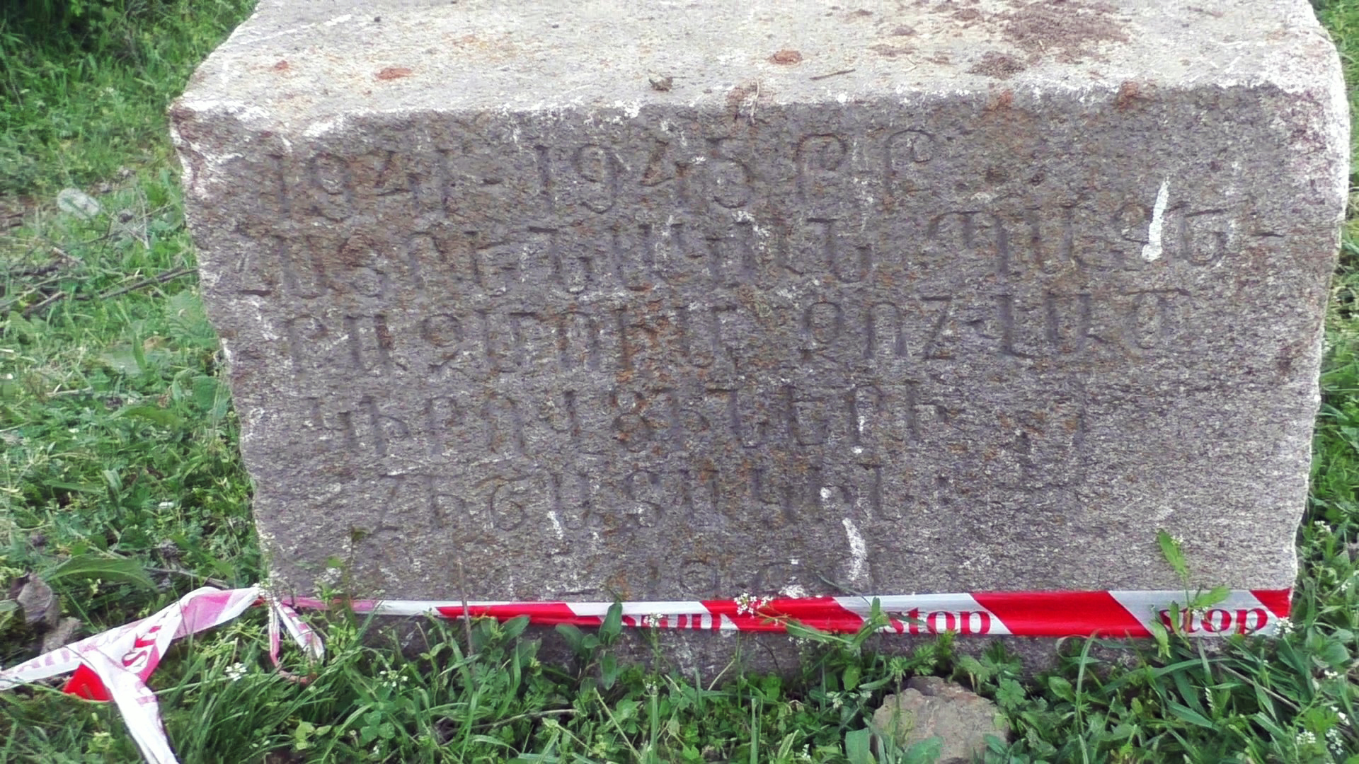Заинтересовал камень, явно снятый с родника с надписью на армянском и памятной датой 1941 - 1945 гг. Оказывается, при расширении дороги его сняли и перенесли сюда, пока не решат, куда его снова поставить.