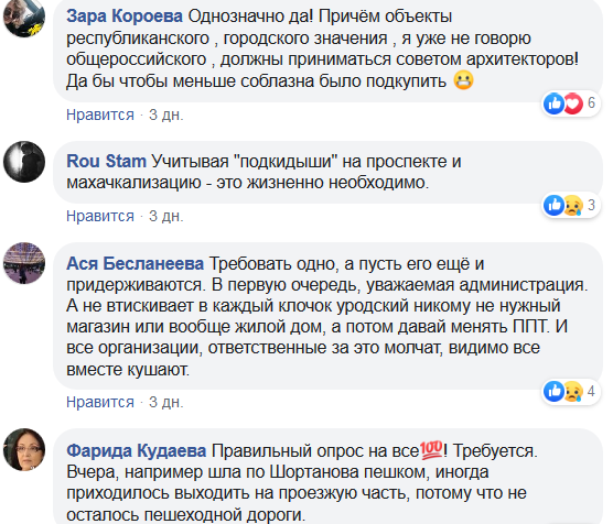 Дали ответ «да» - 235, «нет» - 3 и «не считаю это проблемой» - 2 человека. Участники группы, оставившие 74 комментария,  единодушны в том, что застройка Нальчика ведется неудовлетворительно, непродуманно.