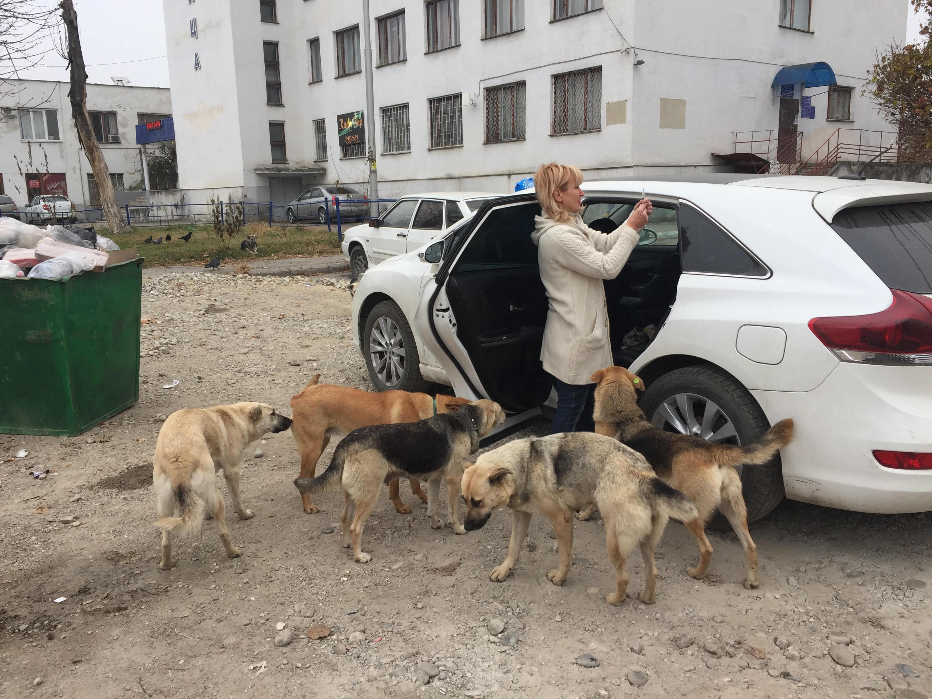 Оксана рассказала, что собака родила щенят в подвале жилого дома, через некоторое время кто-то выбросил их на улицу. Из пятерых щенков выжил один, которого она подобрала и выходила у себя в квартире. Оксана и кормит бездомных собак, и в случае необходимости делает им  инъекции.